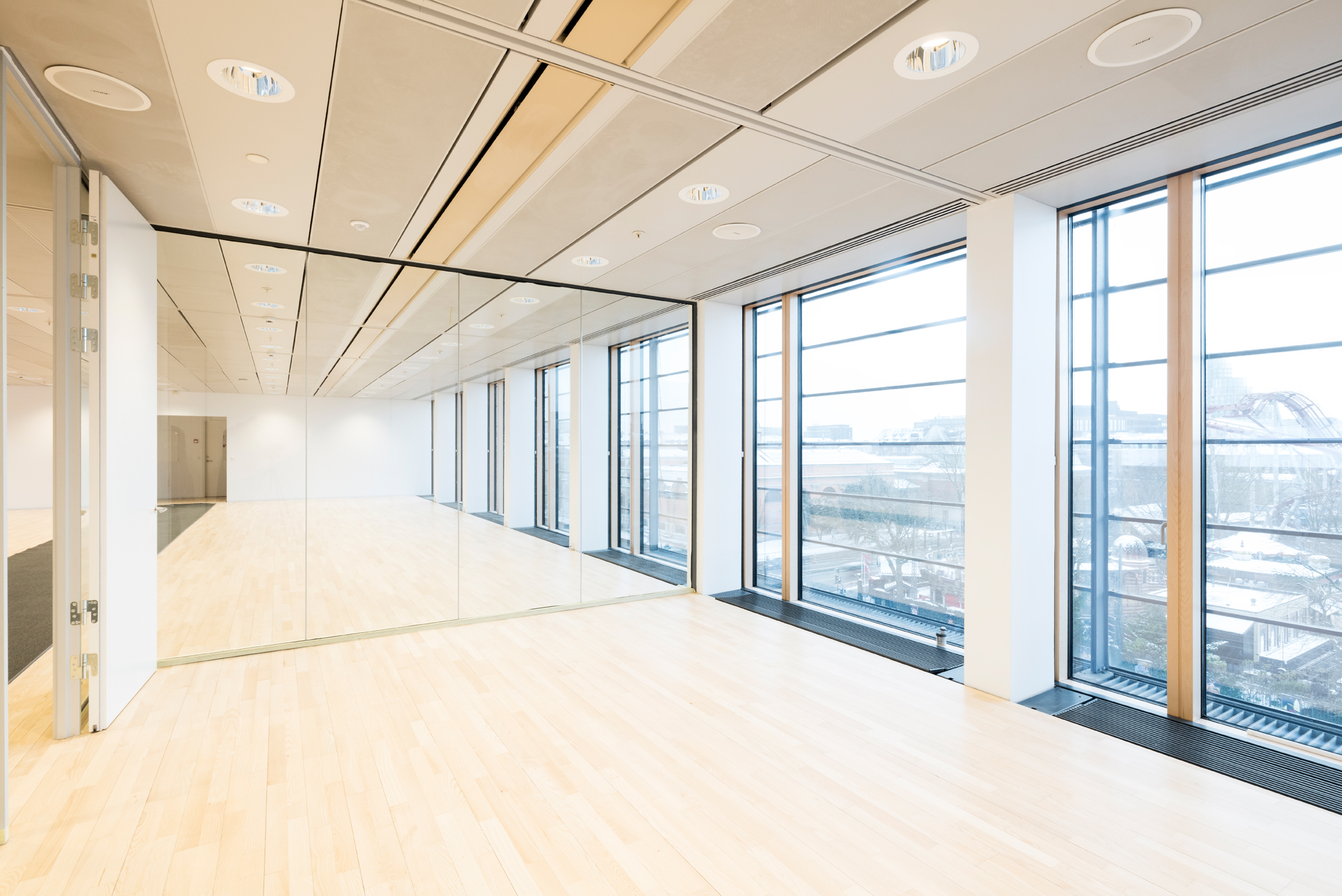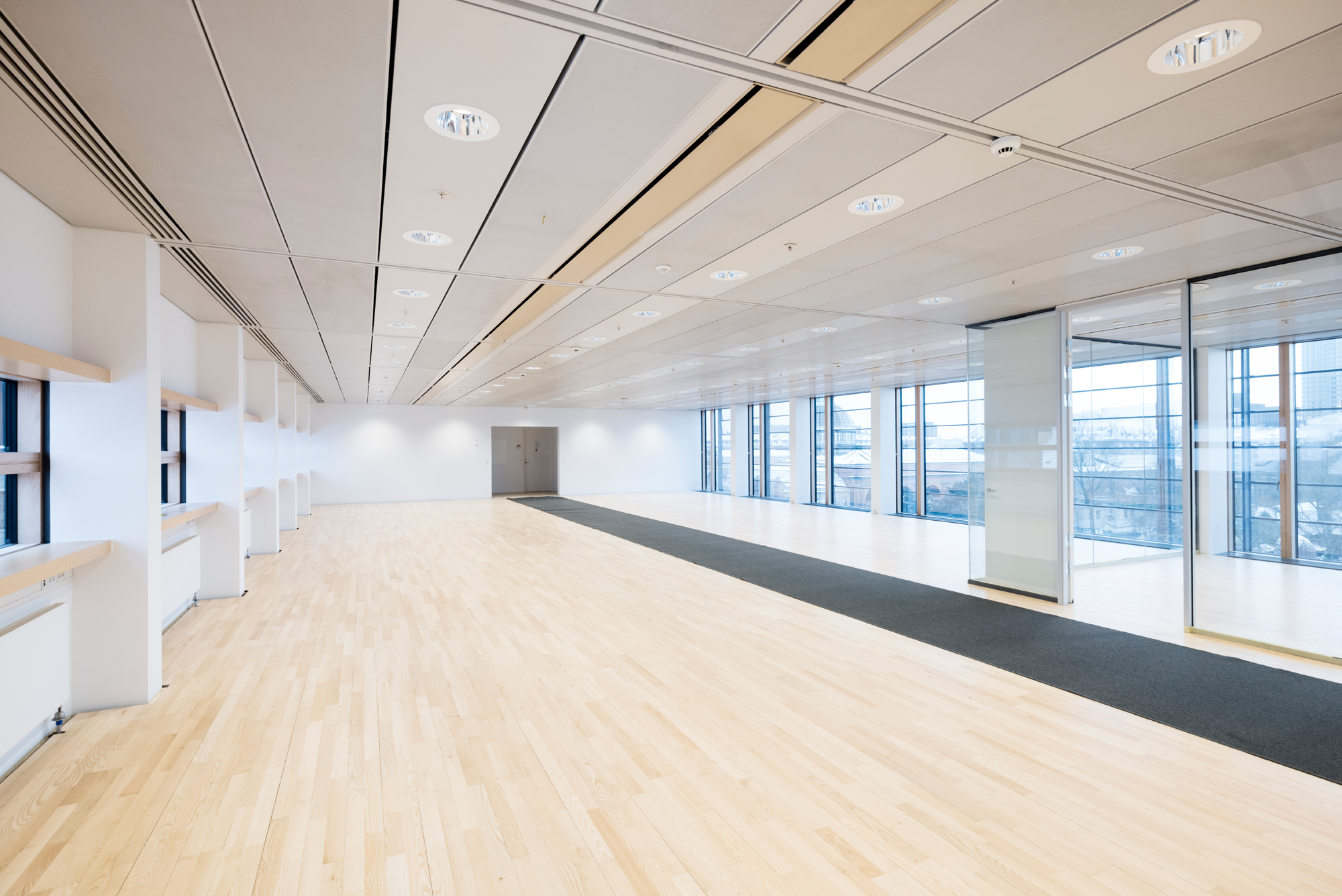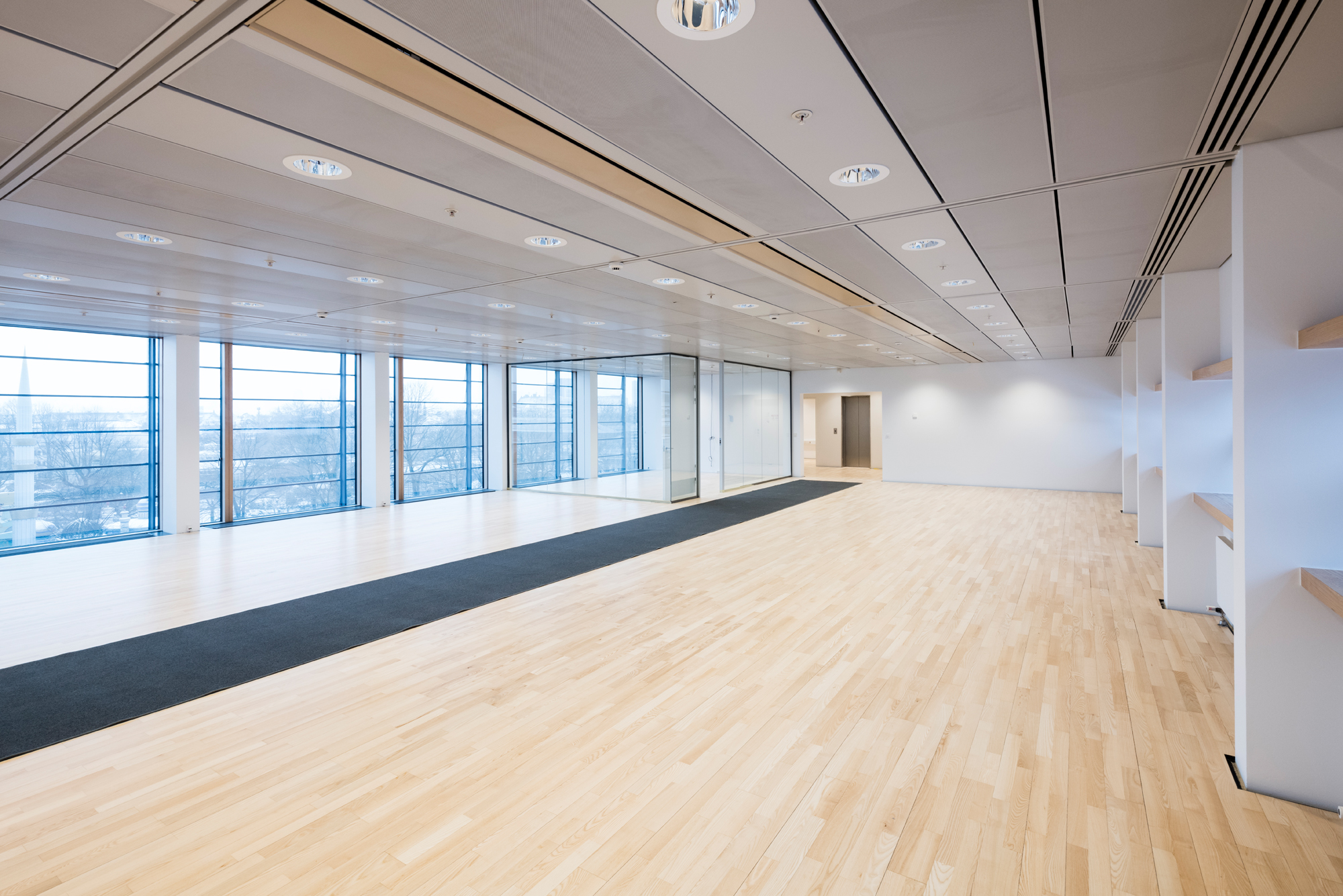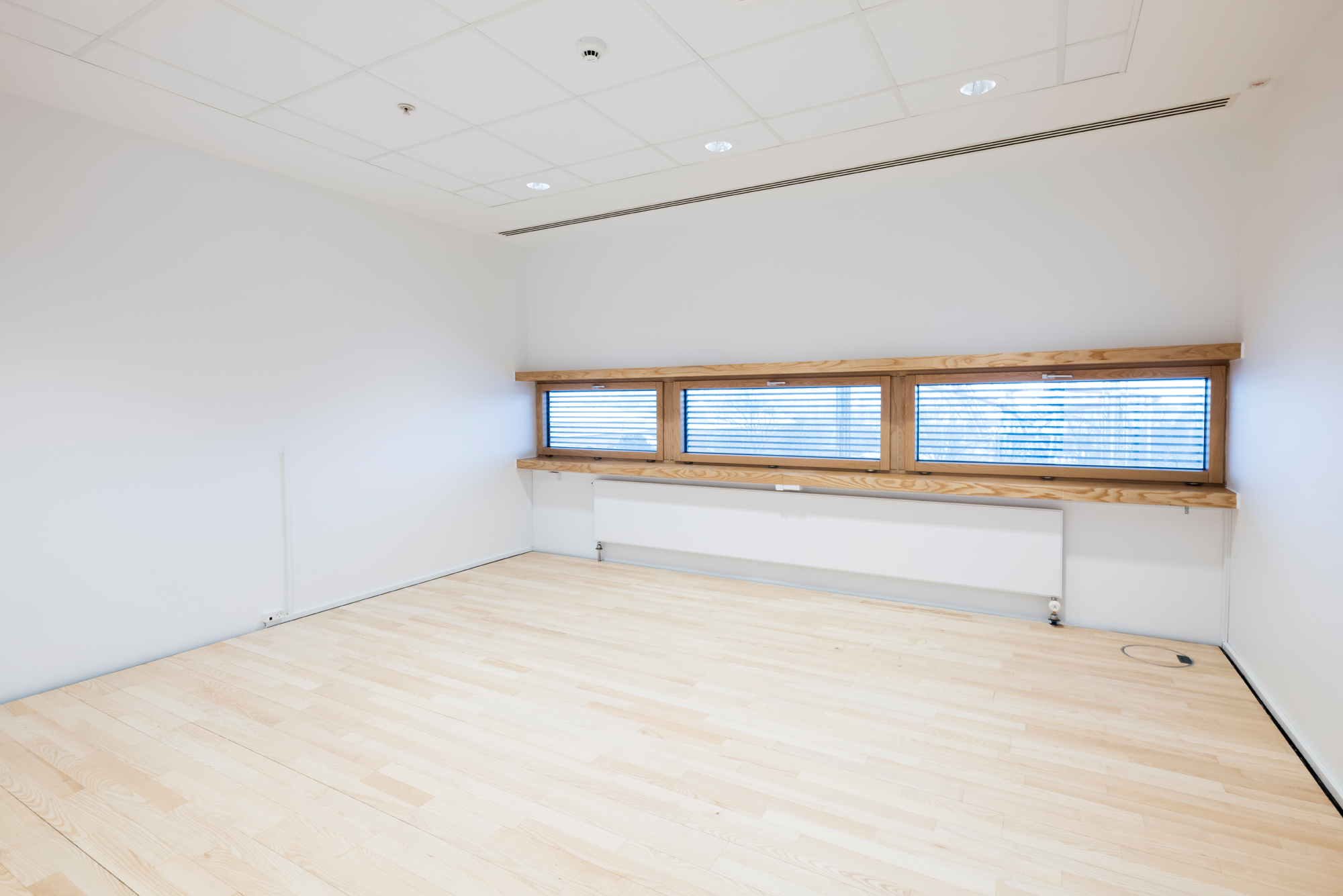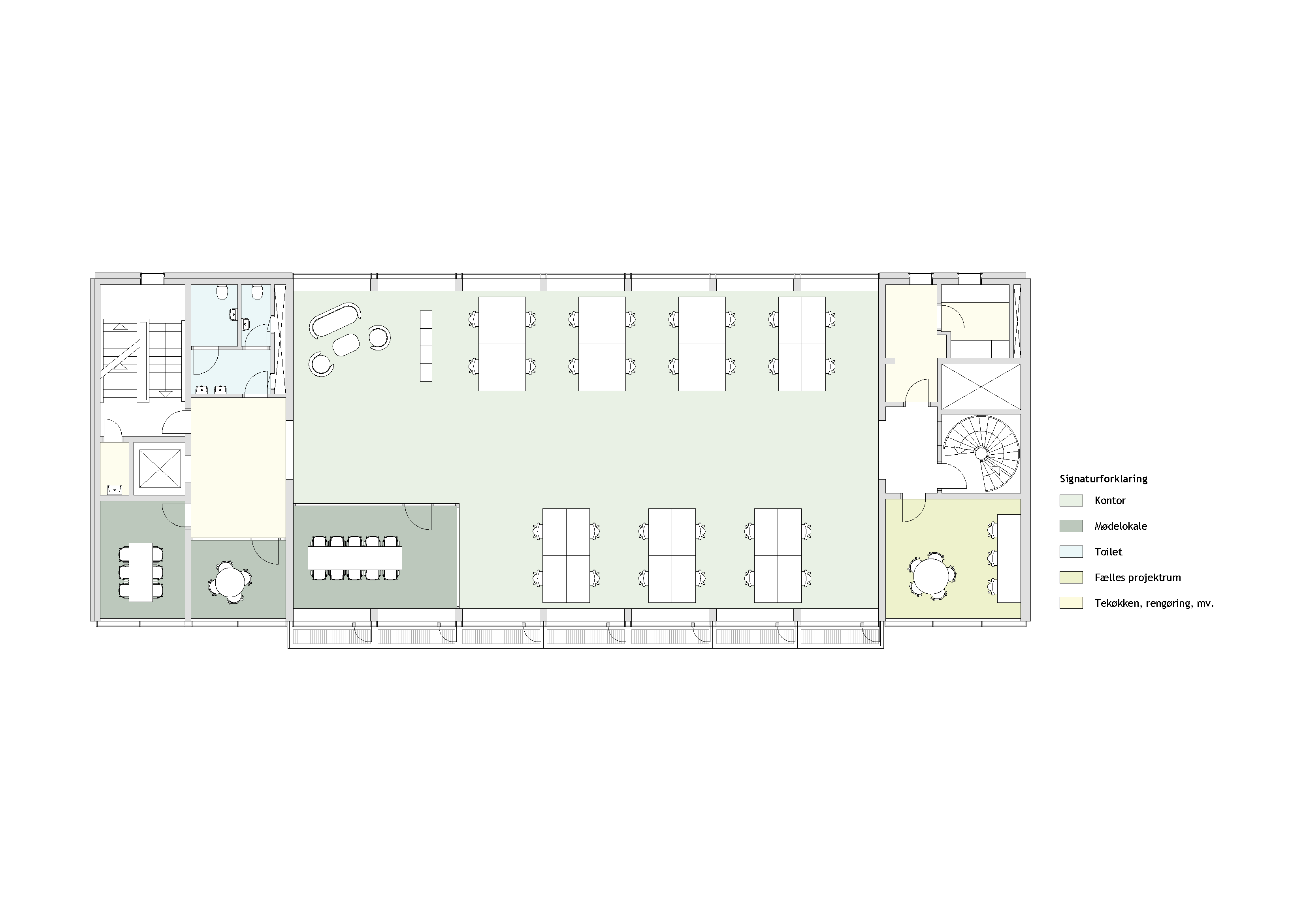Kontoret er indrettet som et lyst og fleksibelt storrumsmiljø med plads til ca. 30 arbejdspladser samt et større mødelokale, tekøkken og opholdsrum. Indeklimaet er sikret med både køl og ventilation.