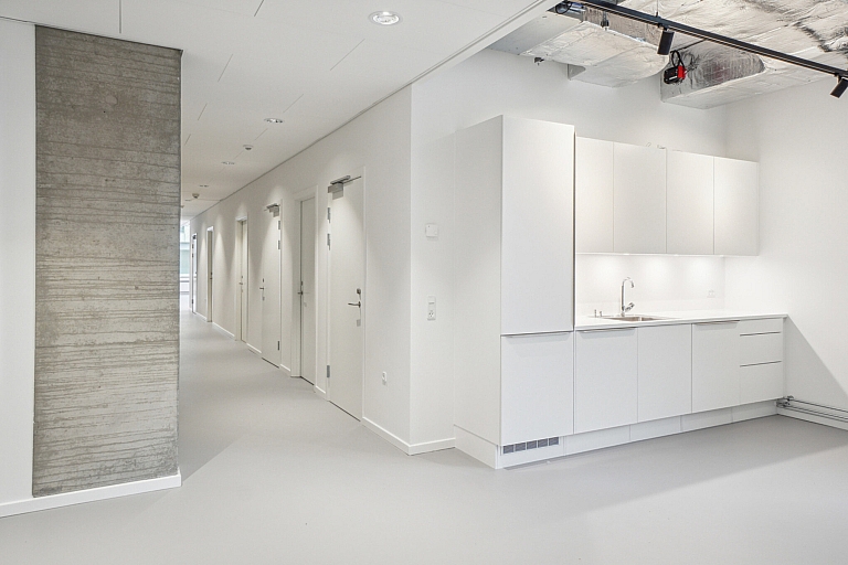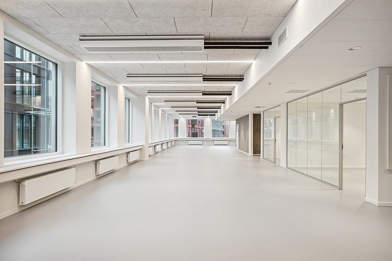 The available office is located on the first floor of the property, offering a magnificent view of the Carlsberg City. The office is accessed through a well-maintained staircase and elevator, which operates from both the parking basement and ground level. The materials are kept in light tones with an elegant raw edge, featuring exposed concrete surfaces, glass, and white-painted walls. The office is designed with high ceilings and sound regulating panels, along with light grey floors that contribute to good acoustics. The space is arranged as a large, open office area with plenty of light from the large windows, allowing for efficient placement of workstations. Additionally, the office includes two internal meeting rooms located in the core of the space with glass walls facing the open office, an open pantry area with seating options, two storage rooms, and three toilets.