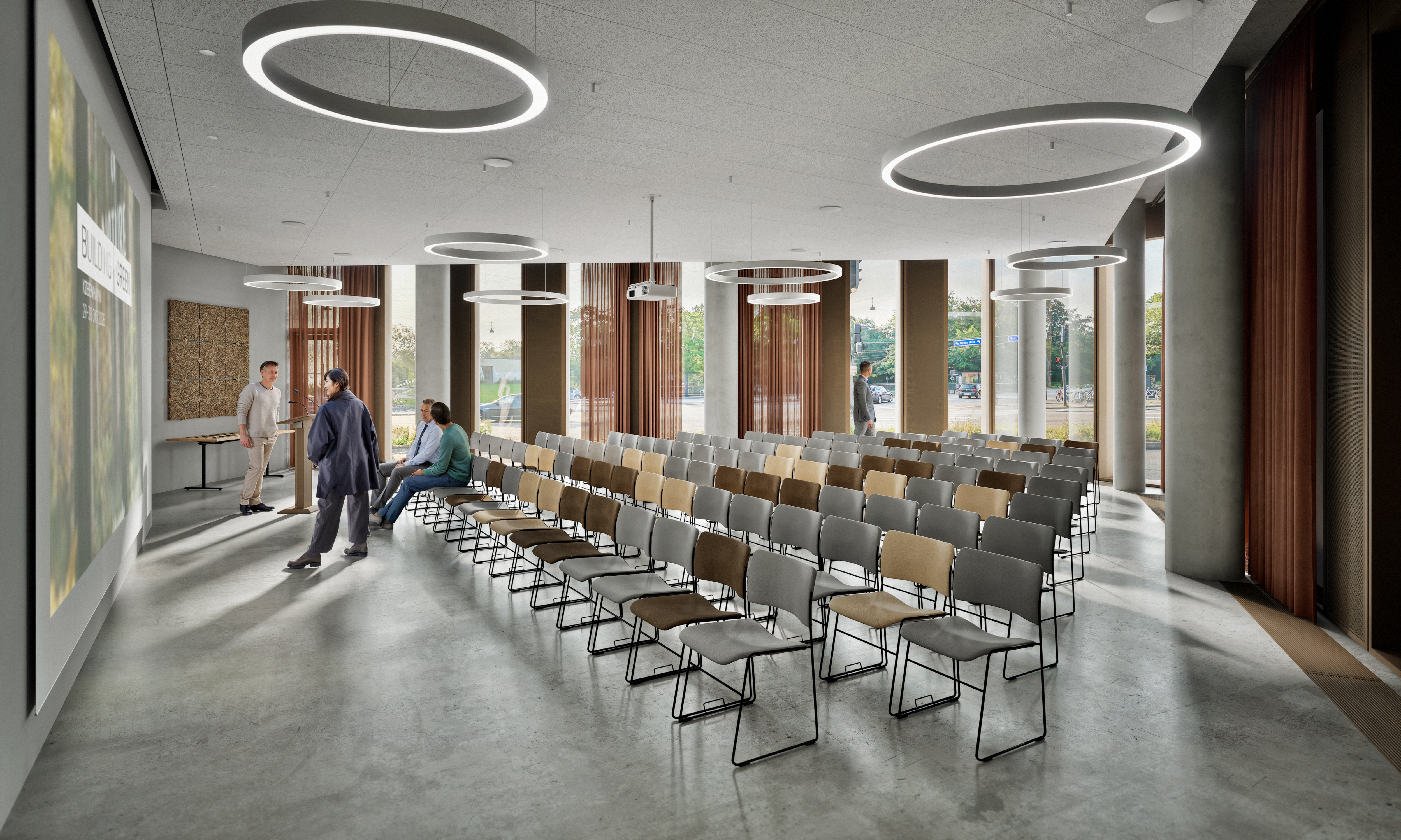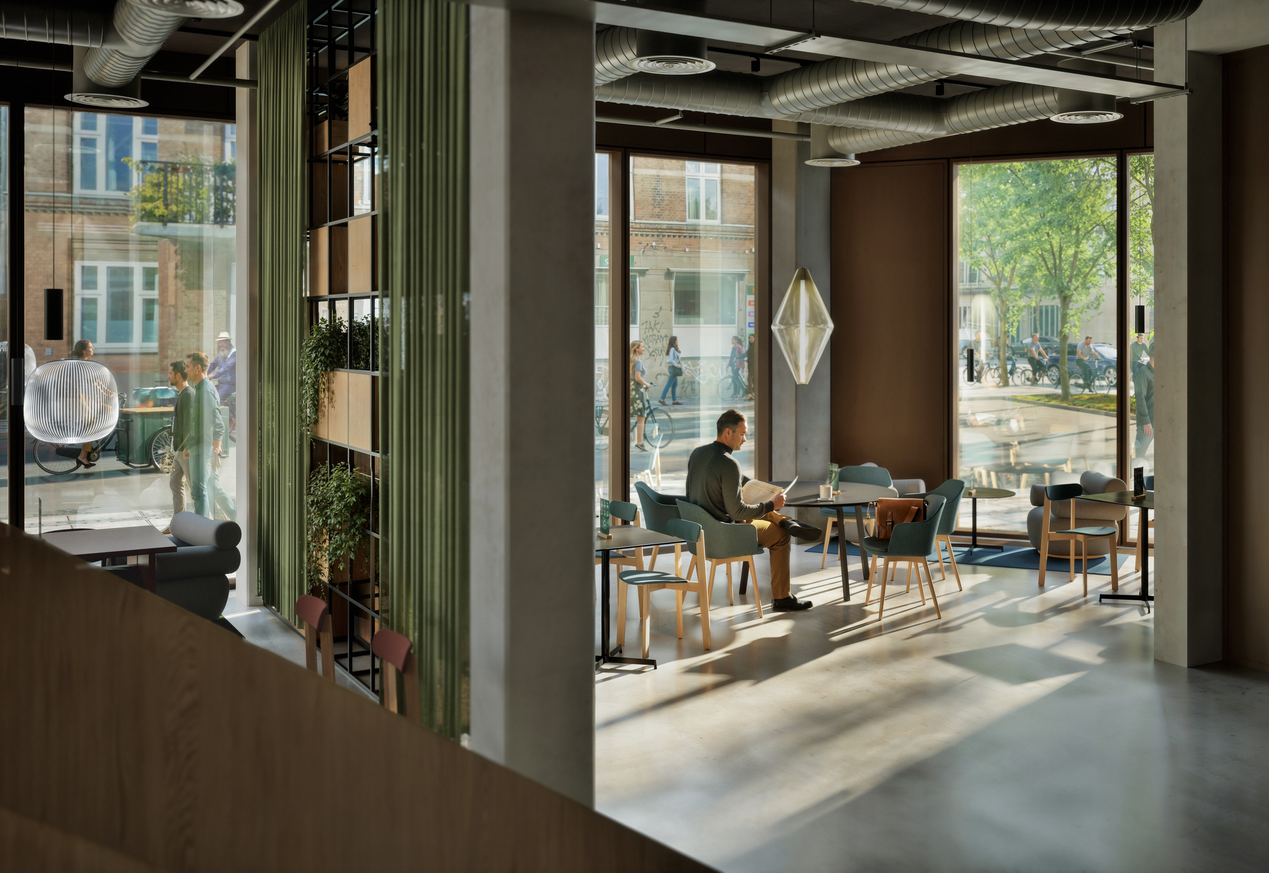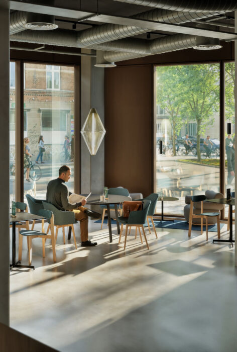 Allerede ved ankomsten bydes husets brugere og gæster velkommen af et lyst og stilsikkert loungeområde, hvorfra der er nem adgang til mødecenteret, bistro, café og de øvrige etager.