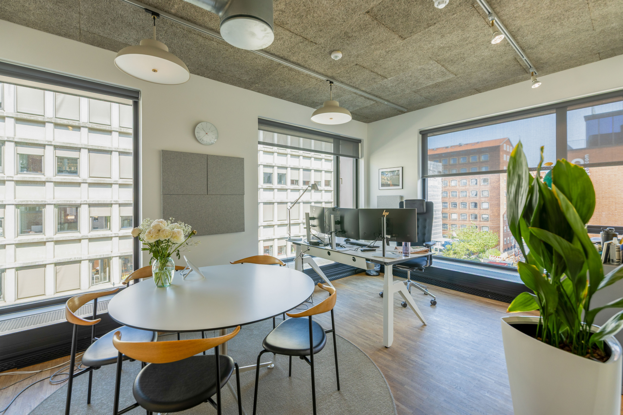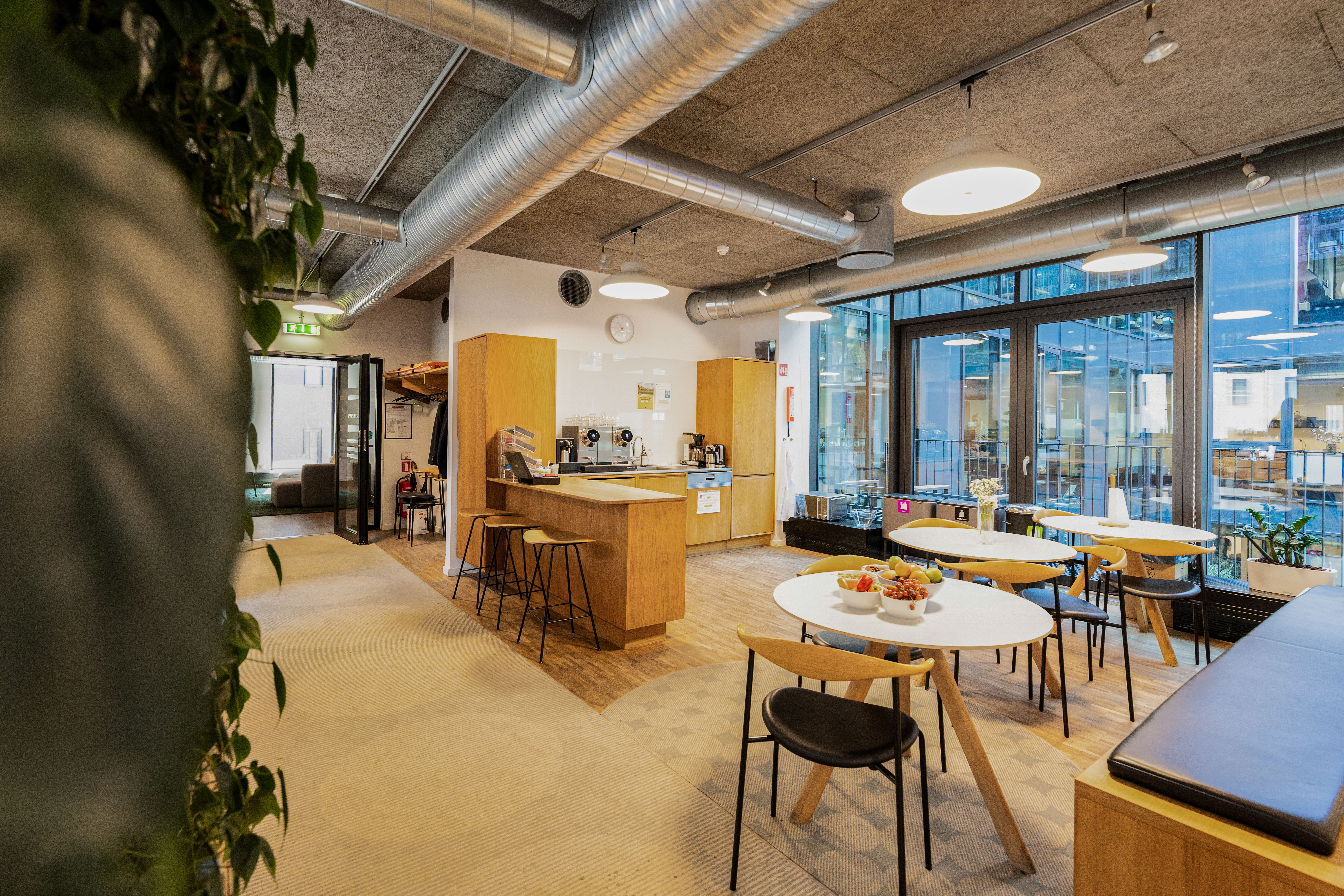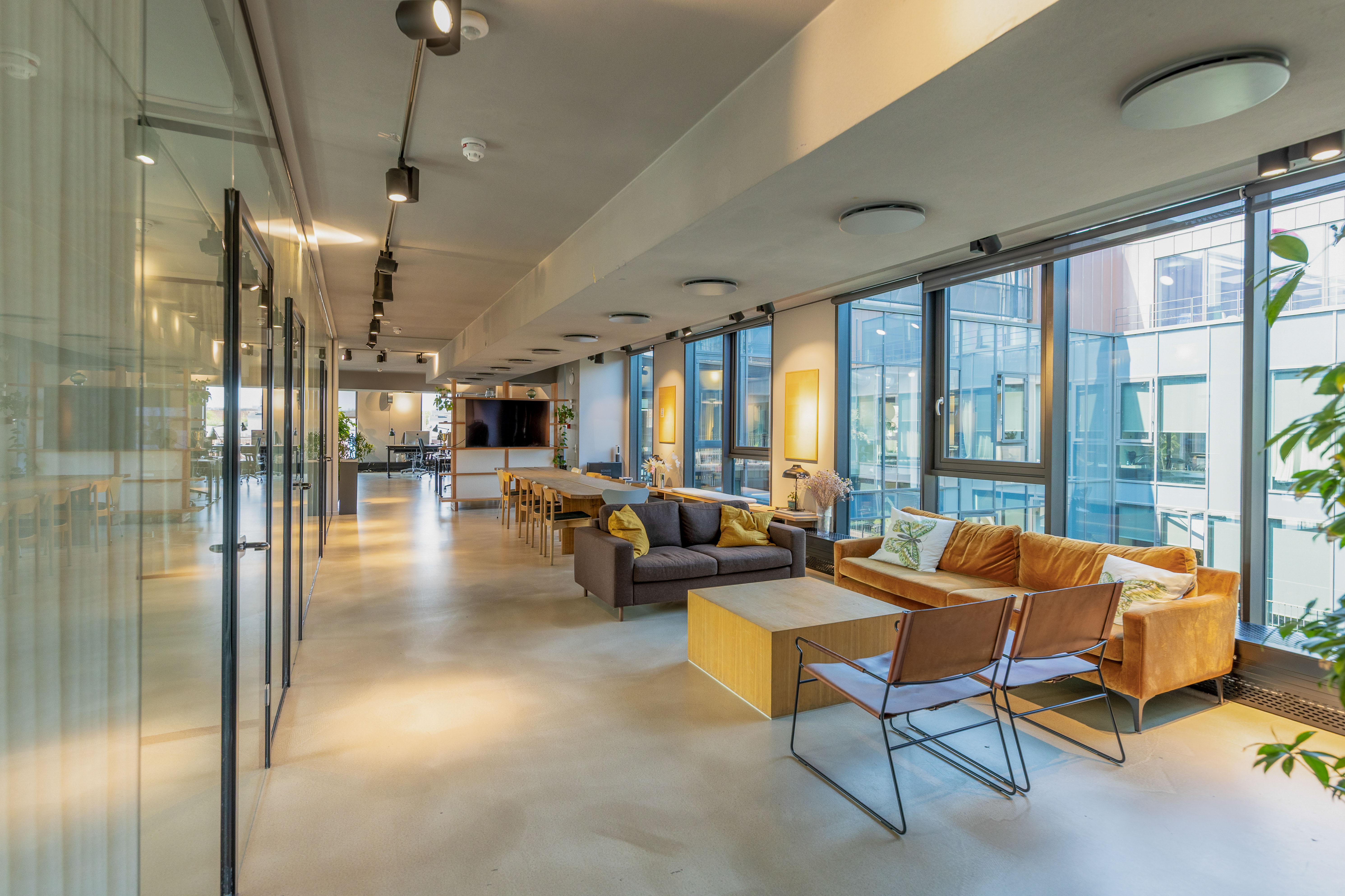 Indenfor bydes du velkommen af en lys og åben opgang. Herfra træder du ind på tredje sal i en fælles lobby, der fører ind til et rummeligt og velindrettet kontorlejemål med blandt andet 37 arbejdspladser som storrumskontor, tekøkken med flere spisepladser, mødelokaler i varierende størrelser og en sydvendt balkon, der ligger ind til gården, hvor man kan trække luft, mærke solens stråler og nyde en rolig stund.