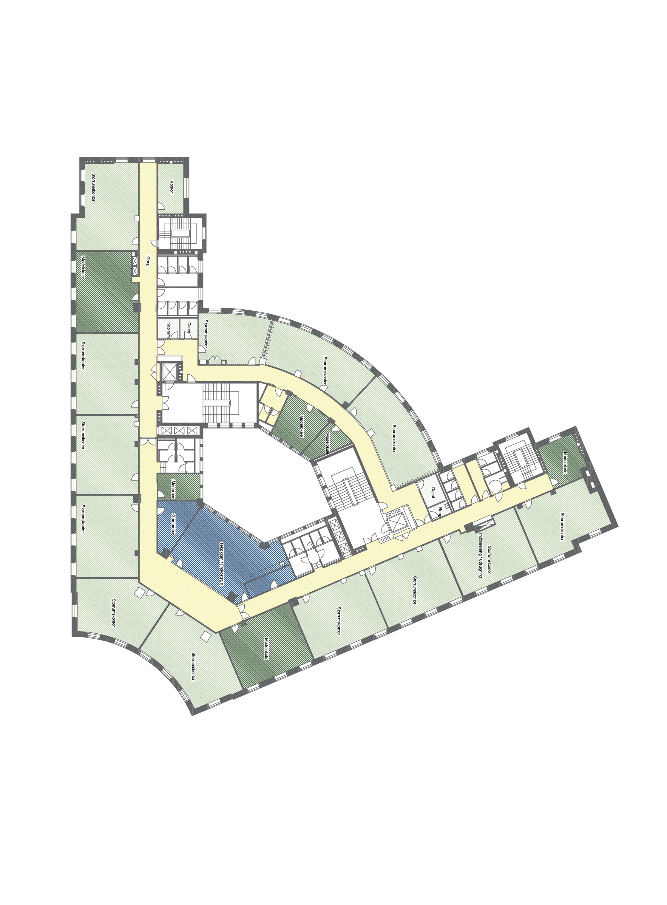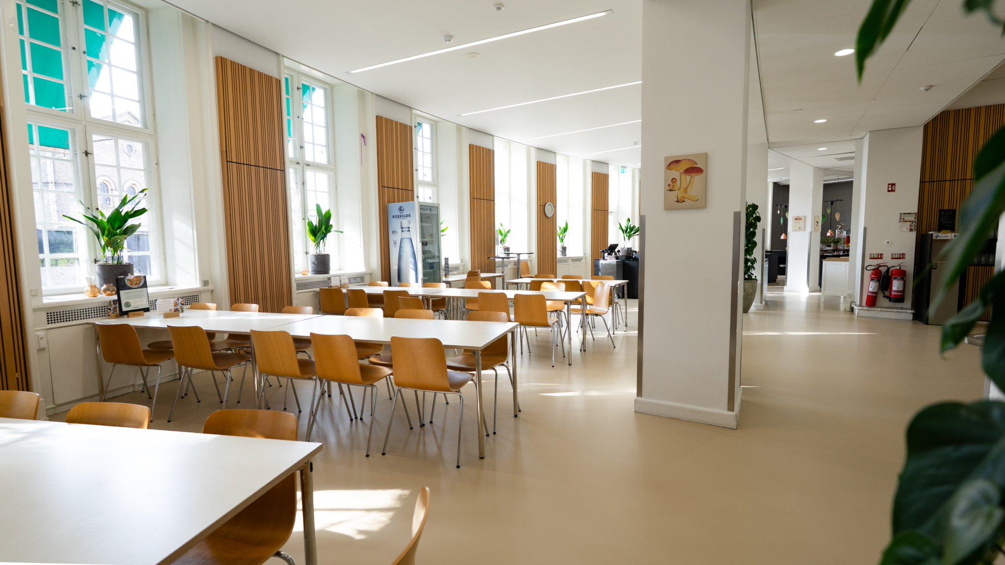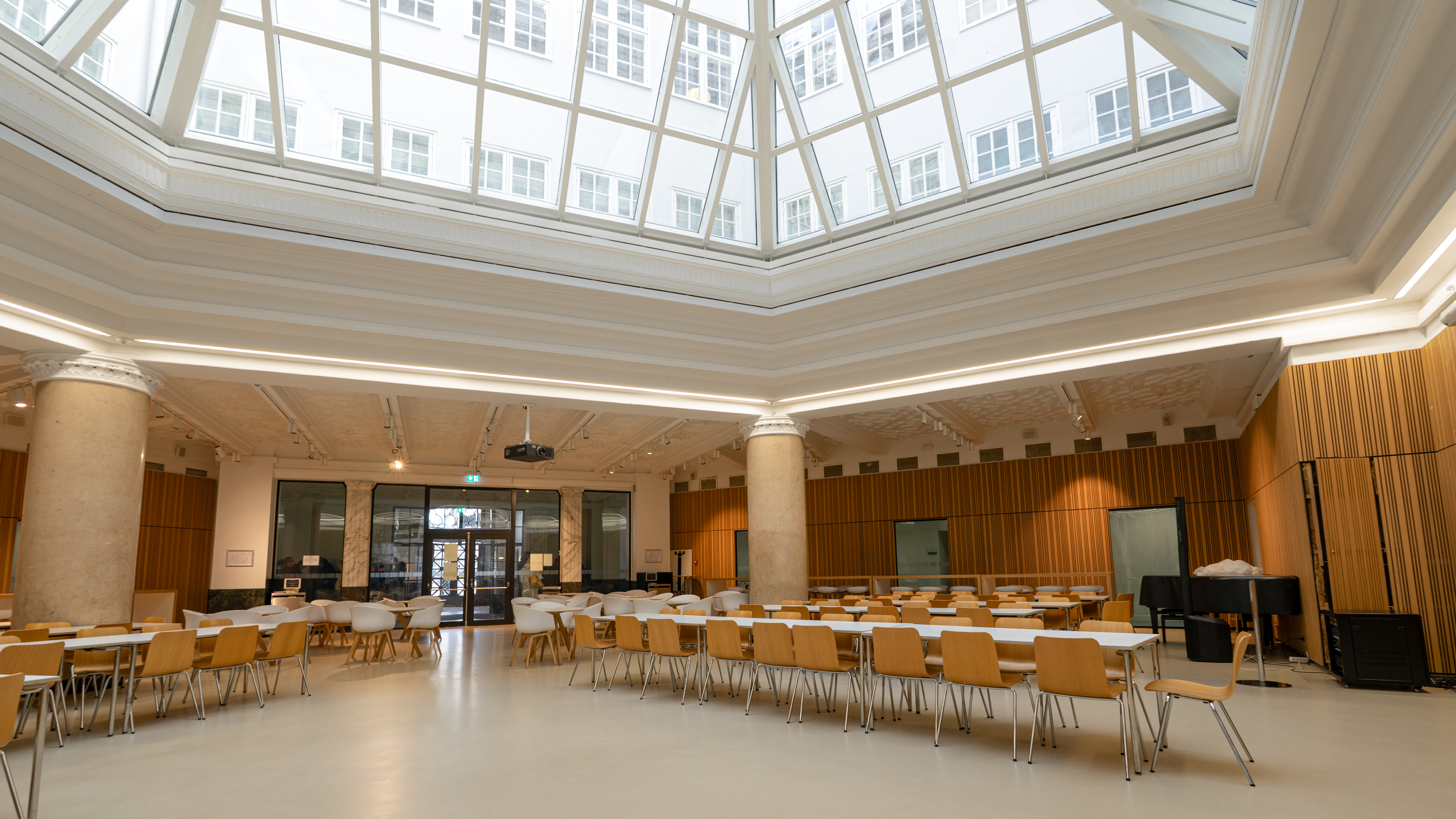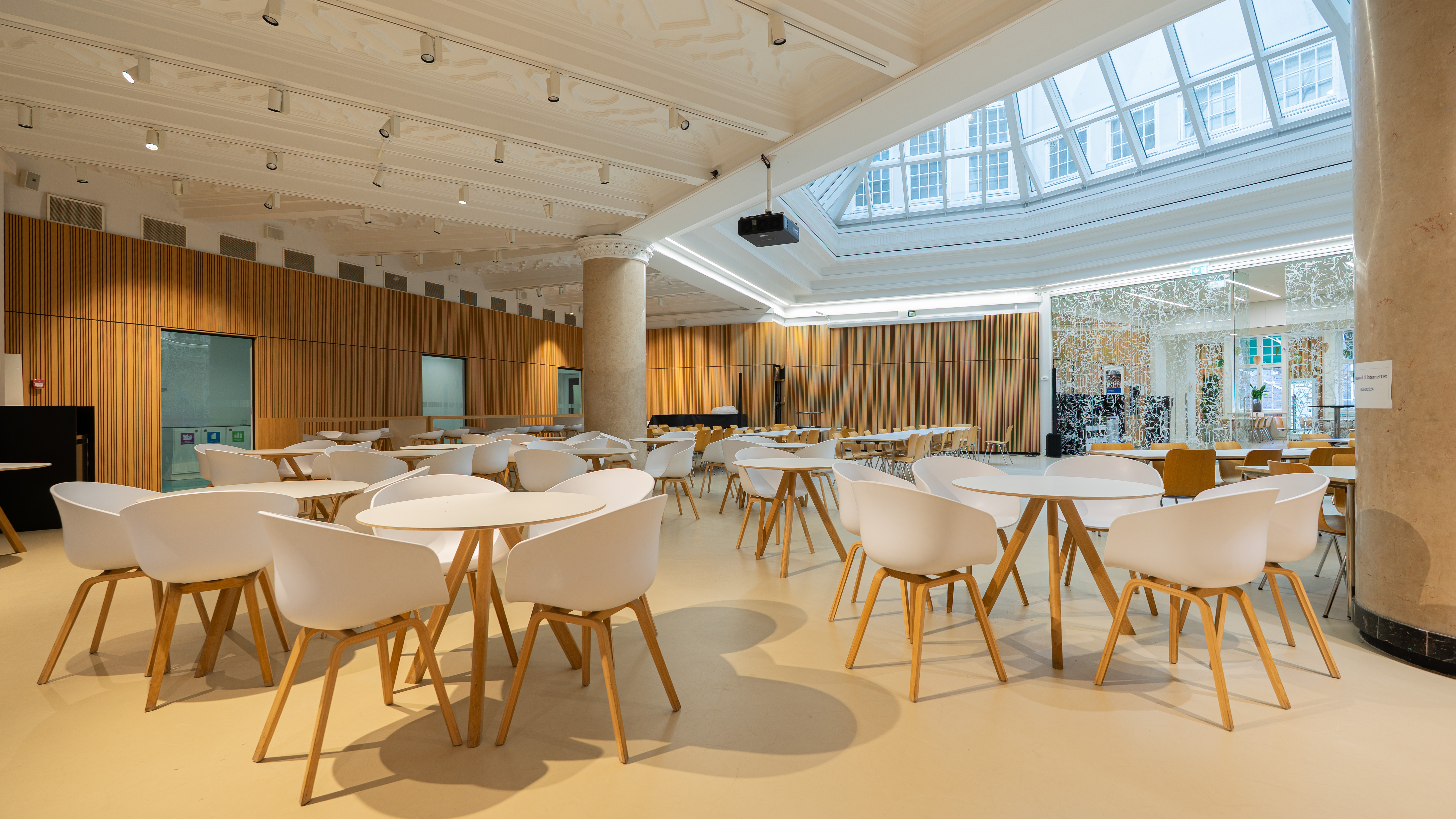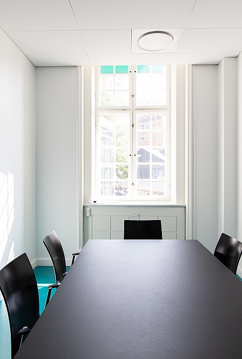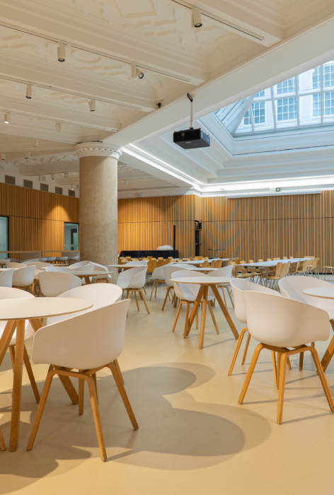 I stuen og på ejendommens 1. sal ligger det ledige lejemål. Her er i dag indrettet med kontorer og mødelokaler i varierende størrelse — alle med flotte, hvidsprodsede vinduespartier, hvorfra der er kig til byens liv. Ejendommens helt unikke A-form giver en stor fleksibilitet og åbner op for spændende muligheder i forhold til indretning af de ledige kvadratmeter. Ejendommens A-form gør det nemt at bevæge sig rundt i lejemålet, og gør det nemt at vidensdele på tværs af organisationen. I stuen kan I samles i A’ets midte i ejendommens fælleskantine, hvor du kan nyde maden i atriummet eller i den hyggelige baggård.