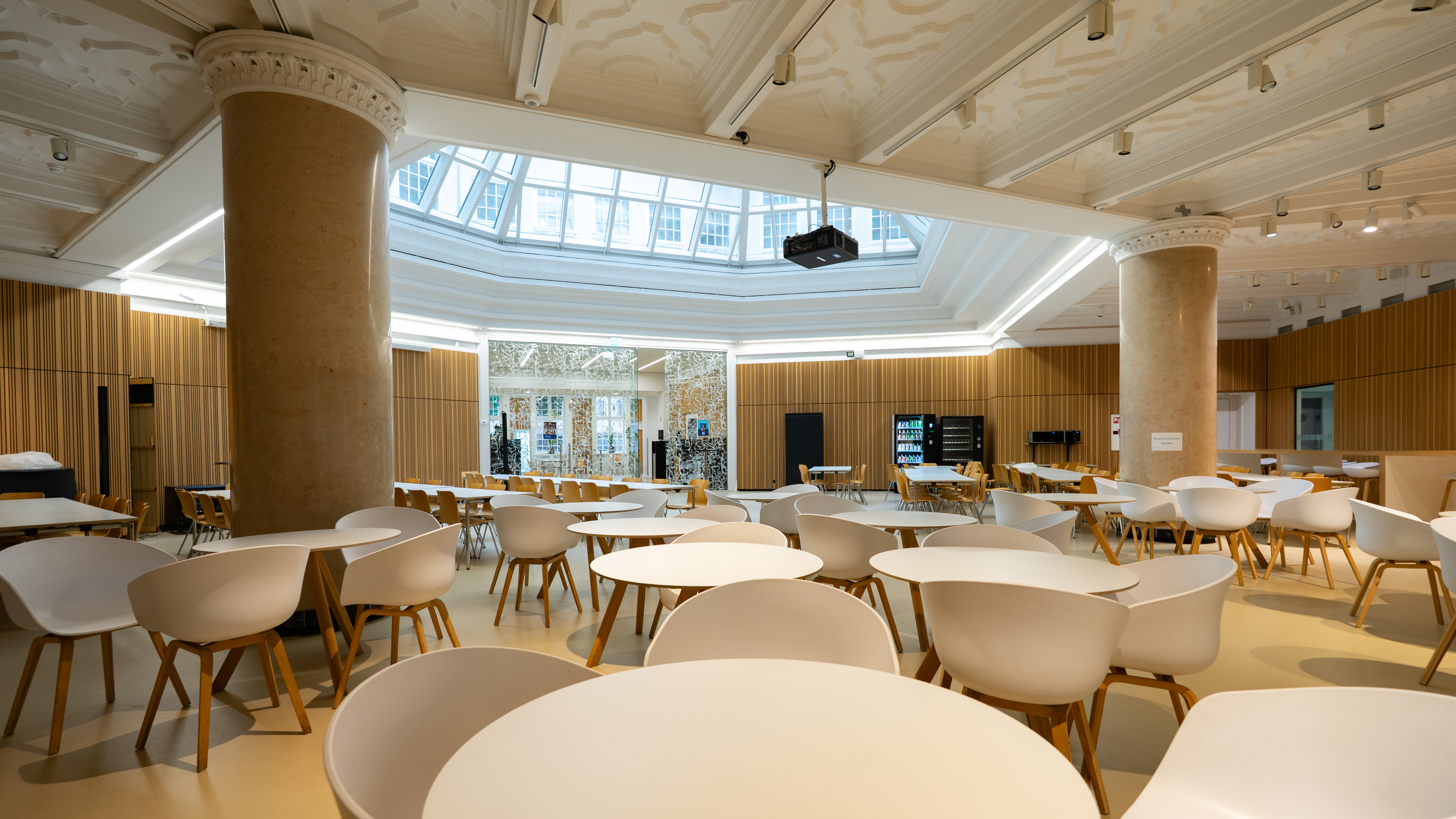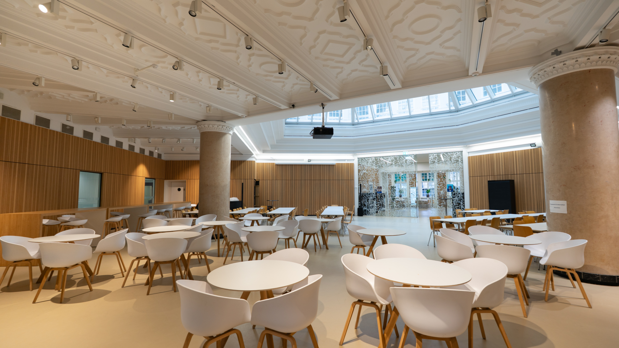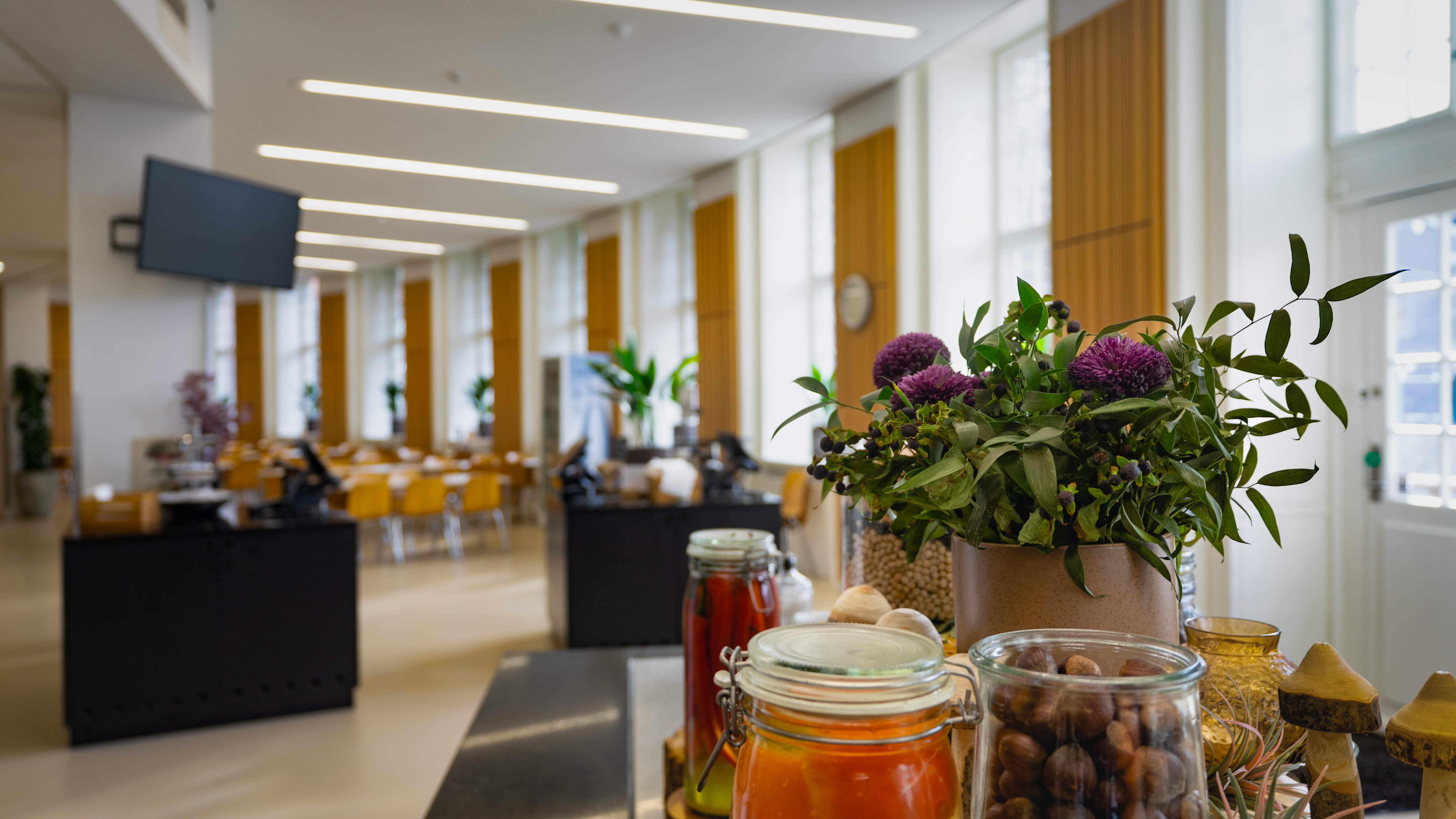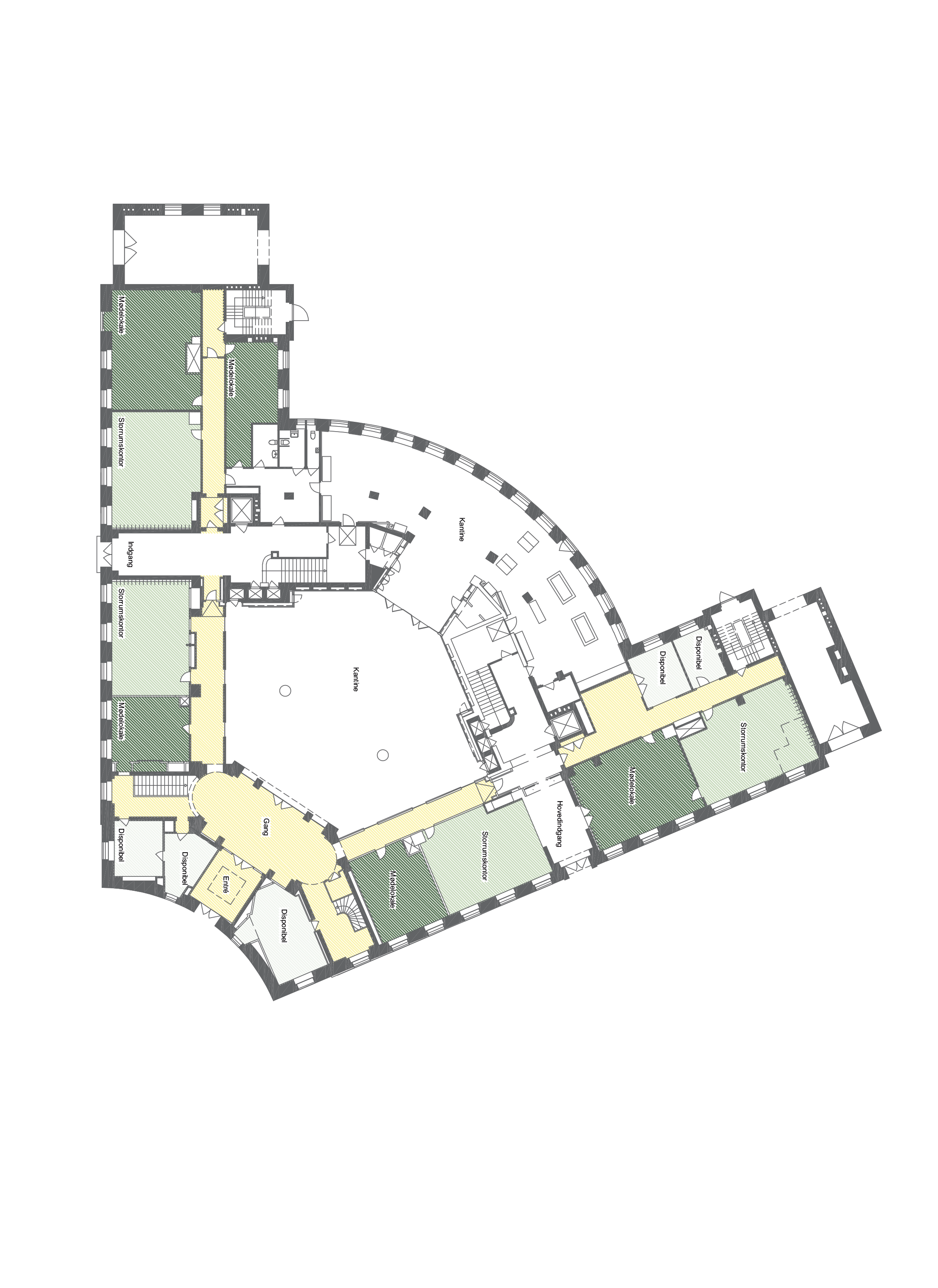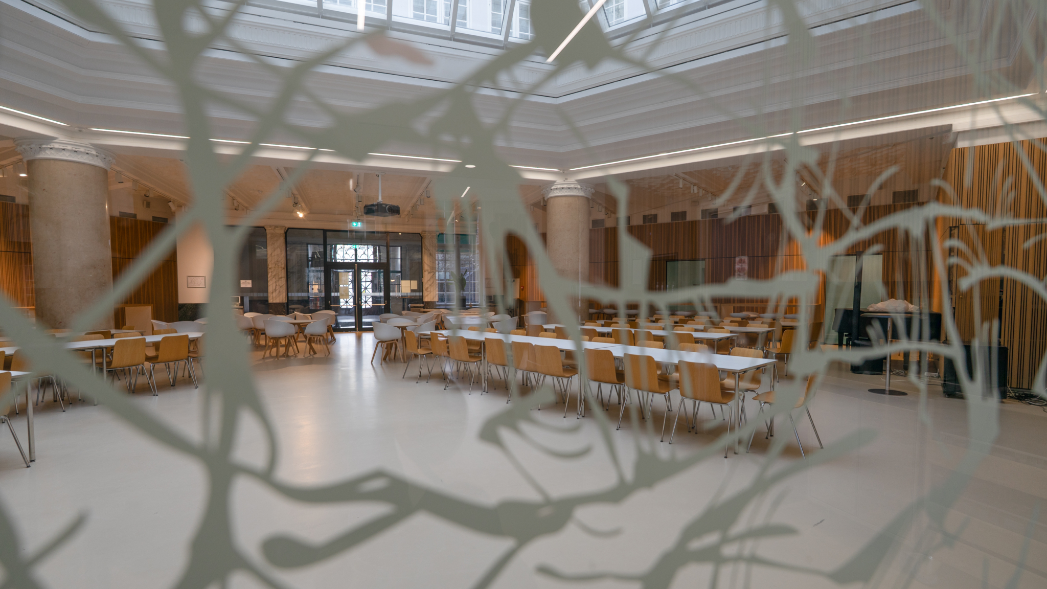 I stuen og på ejendommens 1. sal ligger det ledige lejemål. Her er i dag indrettet med kontorer og mødelokaler i varierende størrelse — alle med flotte, hvidsprodsede vinduespartier, hvorfra der er kig til byens liv. Ejendommens helt unikke A-form giver en stor fleksibilitet og åbner op for spændende muligheder i forhold til indretning af de ledige kvadratmeter. Ejendommens A-form gør det nemt at bevæge sig rundt i lejemålet, og gør det nemt at vidensdele på tværs af organisationen. I stuen kan I samles i A’ets midte i ejendommens fælleskantine, hvor du kan nyde maden i atriummet eller i den hyggelige baggård.
