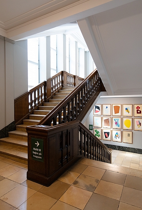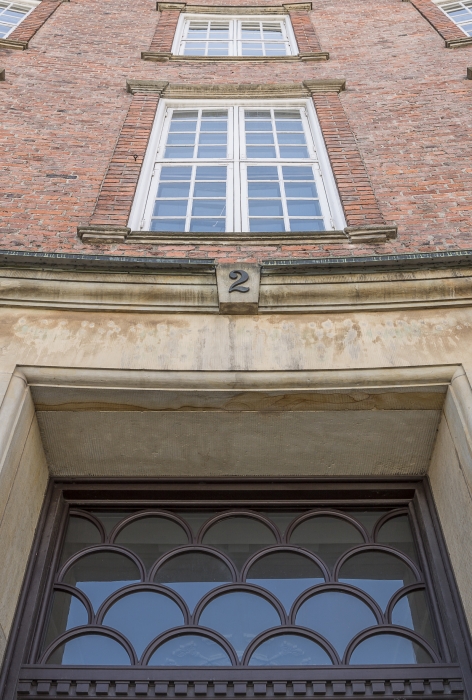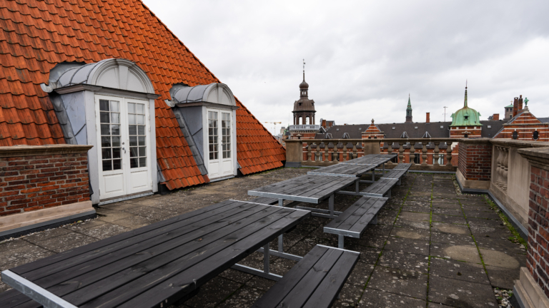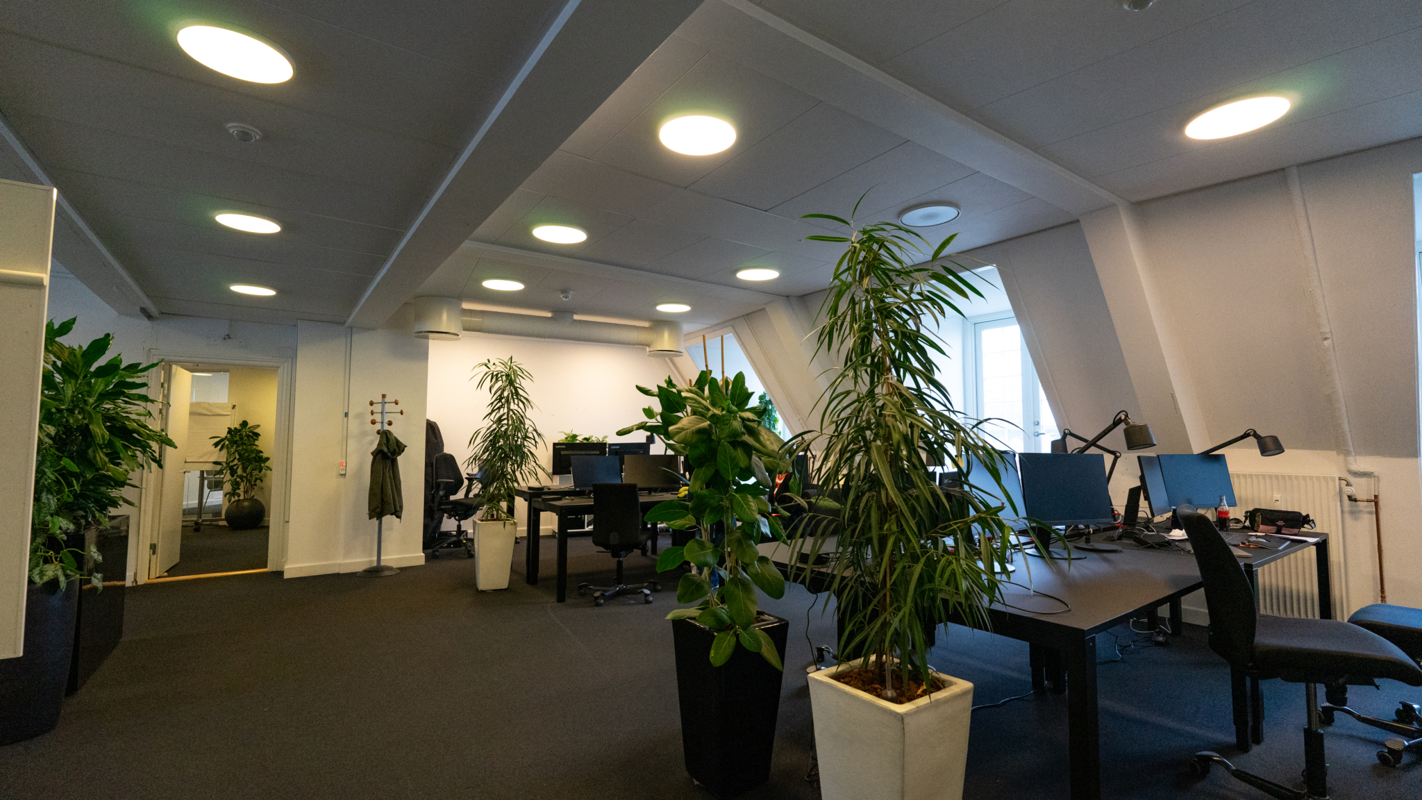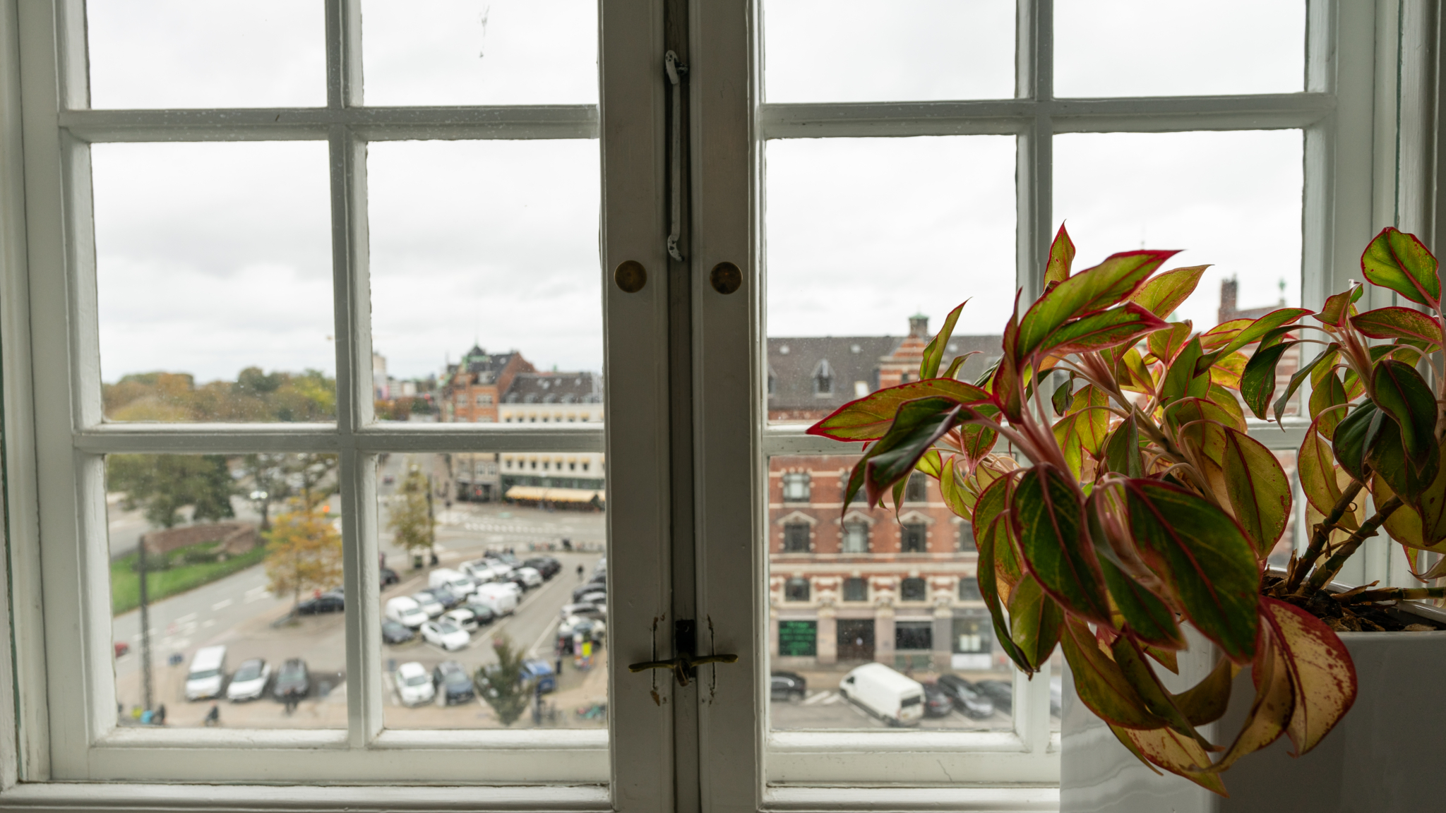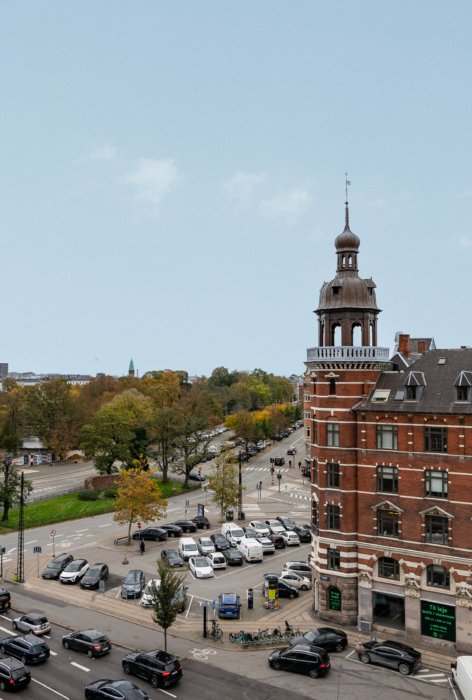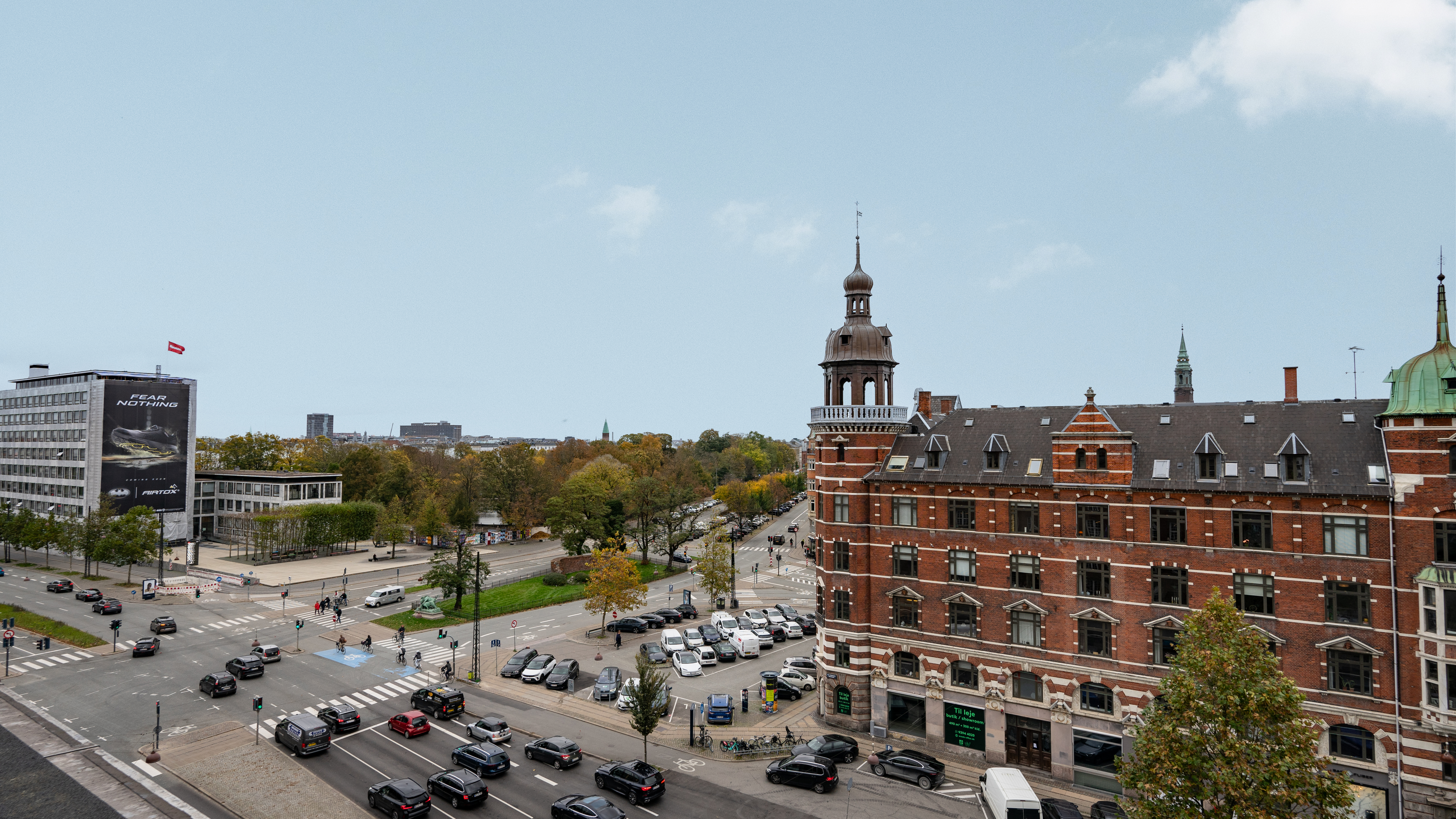 Den herskabelige trappeindgang byder fornemt velkommen hver dag, og herfra kan du tage enten trappen eller elevatoren til ejendommens 5. sal, hvor det ledige lejemål er beliggende. Her er i dag indrettet med kontorer og mødelokaler i varierende størrelse — alle med flotte, hvidsprodsede vinduespartier, hvorfra der er et helt unikt kig til byens liv, samtidig med at lejemålet giver plads til både fordybelse og kreativitet.