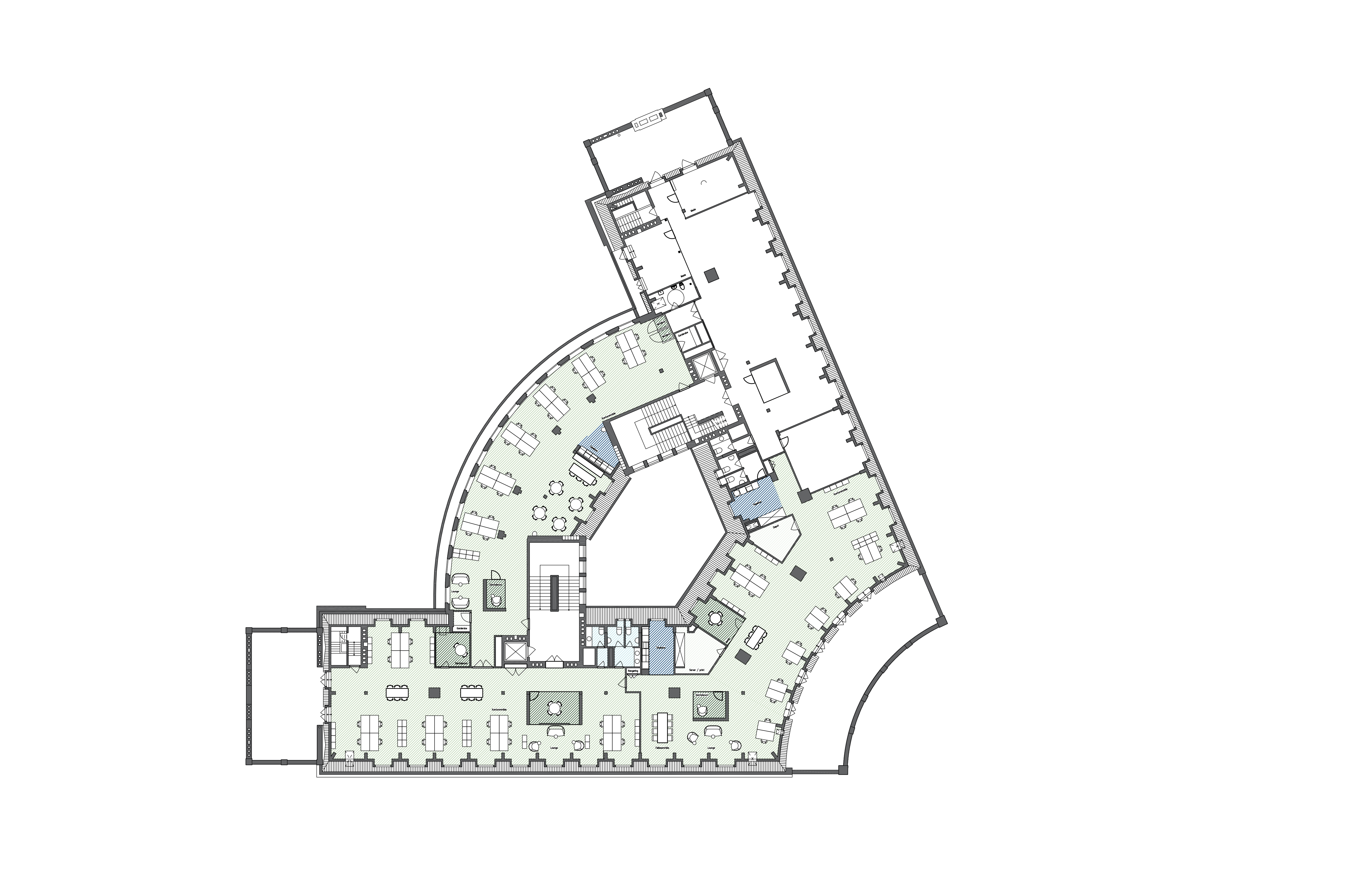 Ejendommens karakteristiske A-form giver en stor fleksibilitet og åbner op for spændende muligheder i forhold til indretning af de ledige kvadratmeter. Desuden gør A-formen det nemt at bevæge sig rundt på kontoret i løbet af arbejdsdagen, hvilket understøtter videndeling og sparring på tværs.