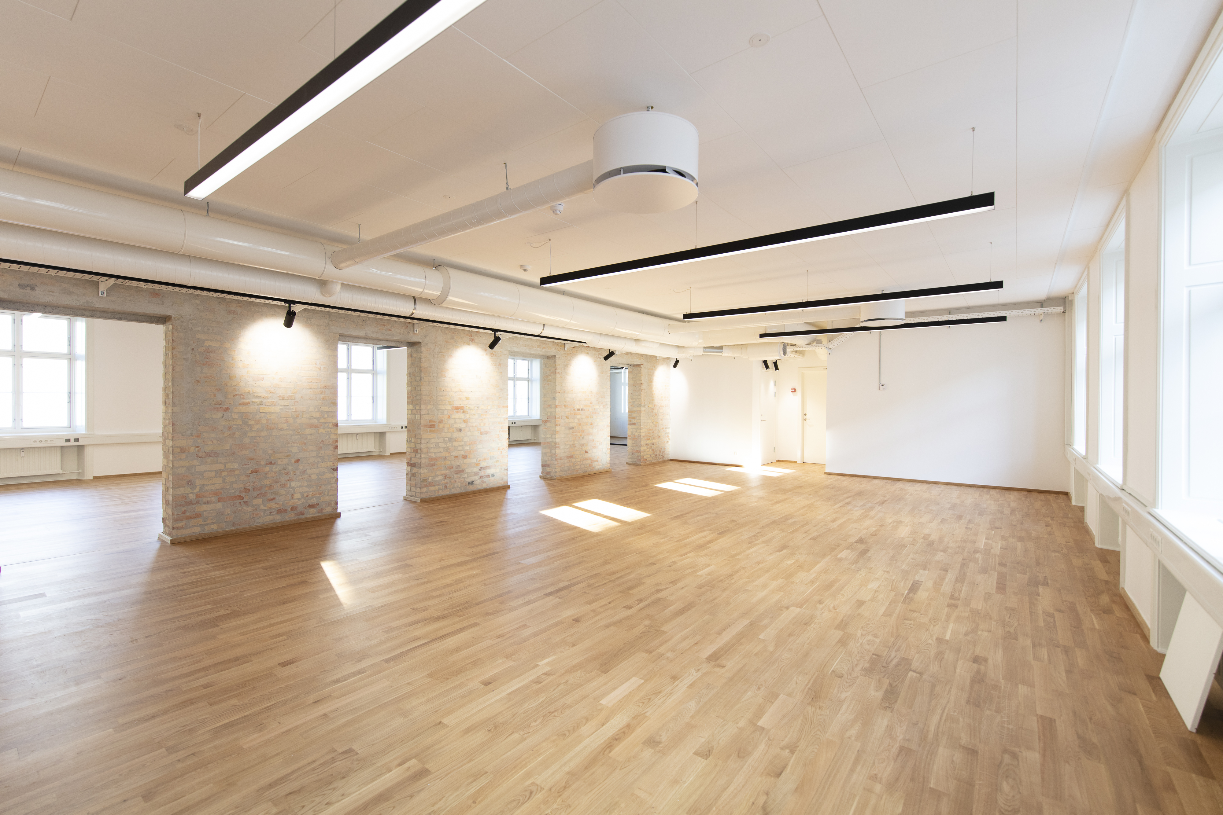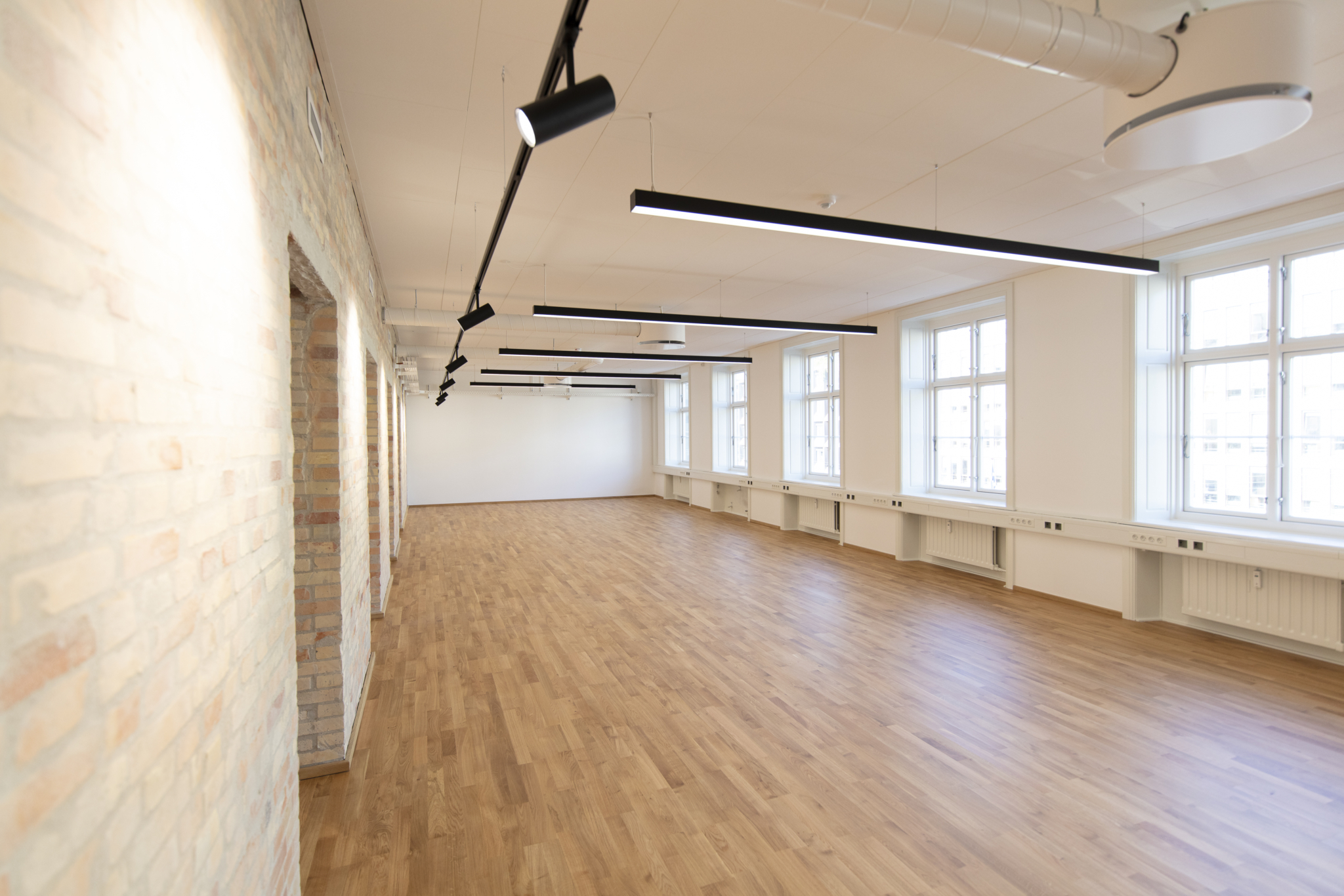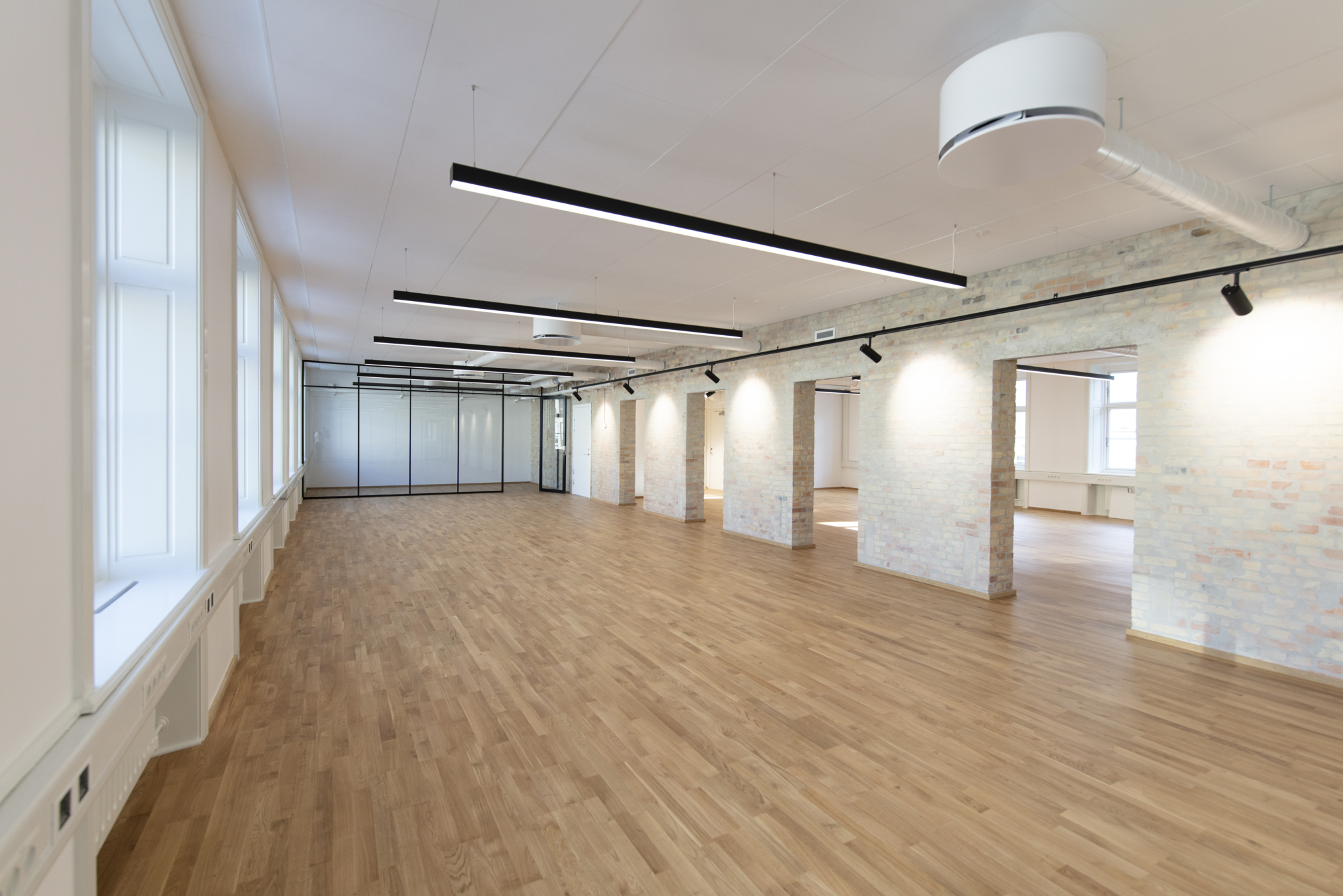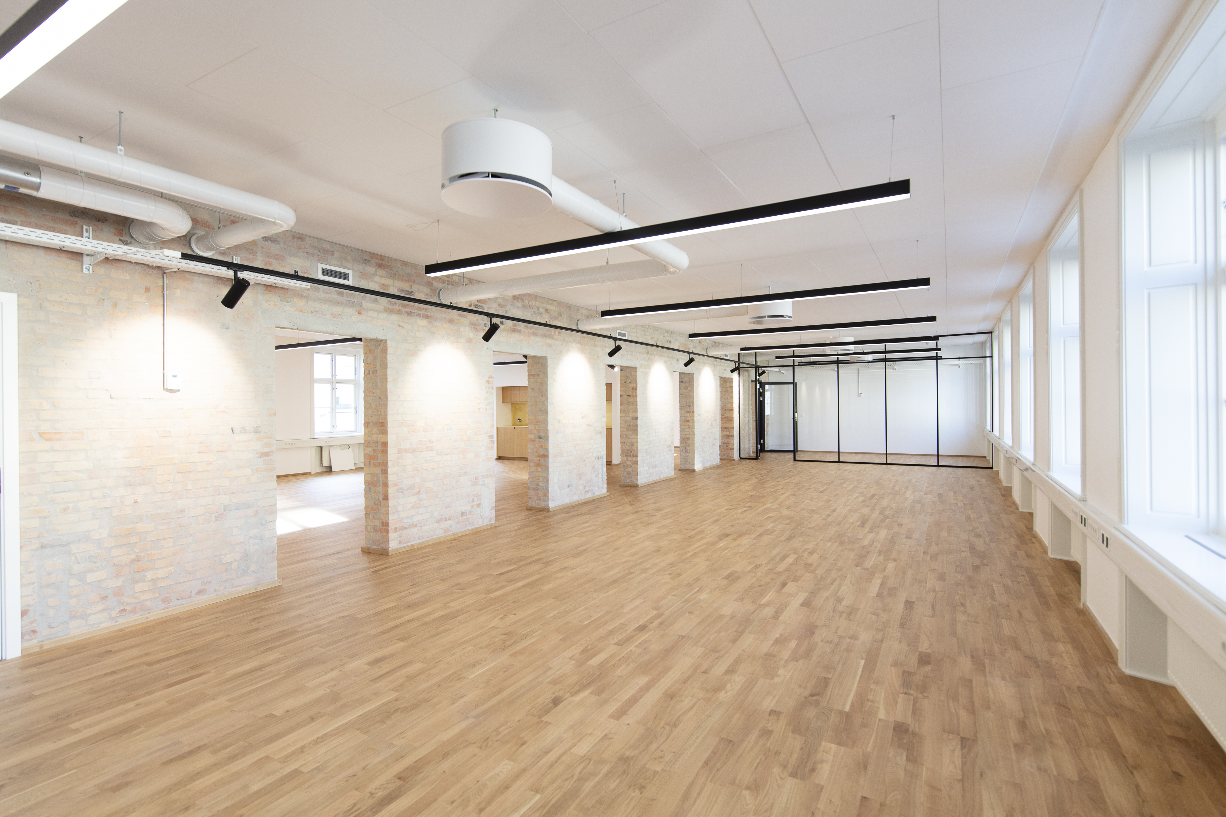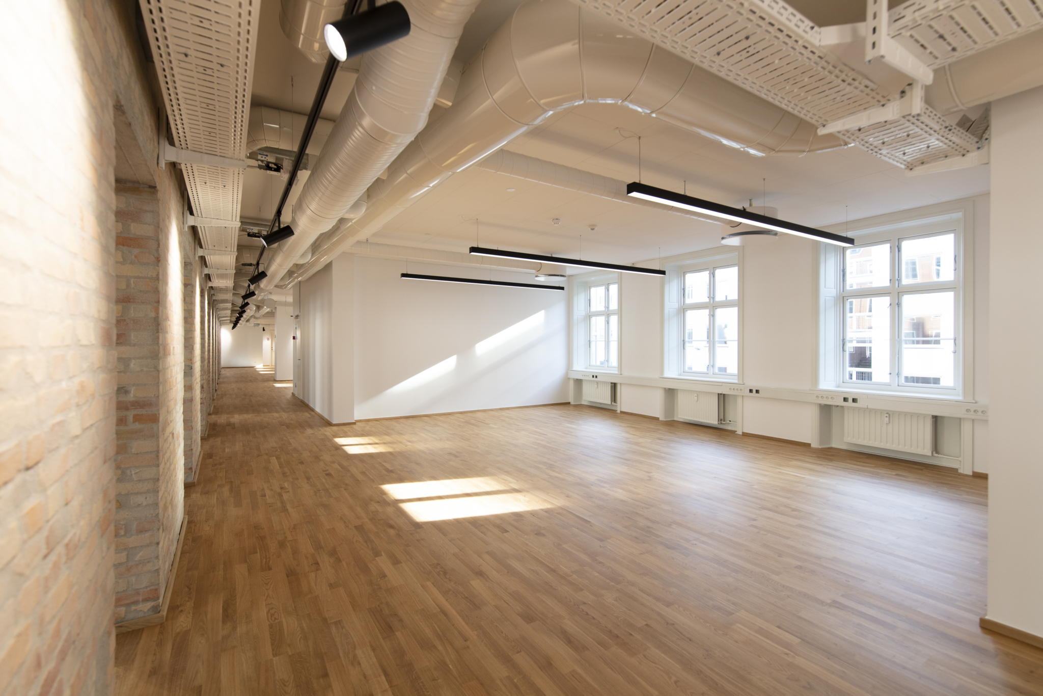 Det nyindrettede lejemål byder på tekøkken, en åben planløsning med stor fleksibilitet og masser af dagslys fra de store vinduer mod gade og gård.