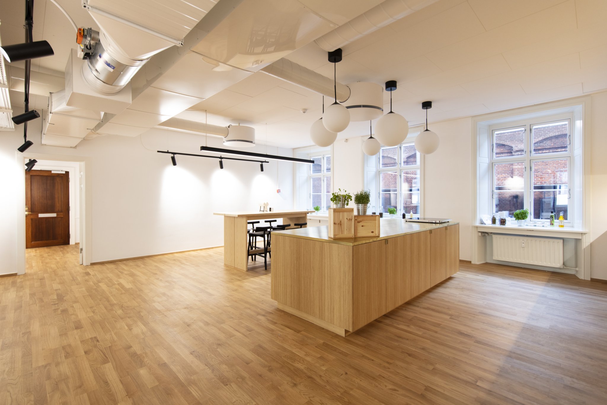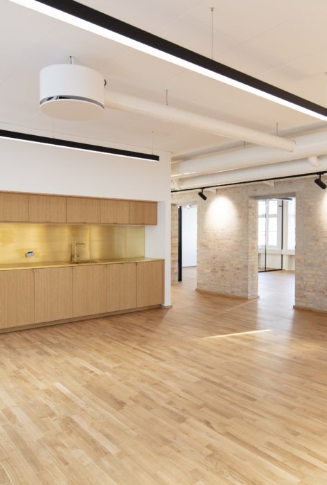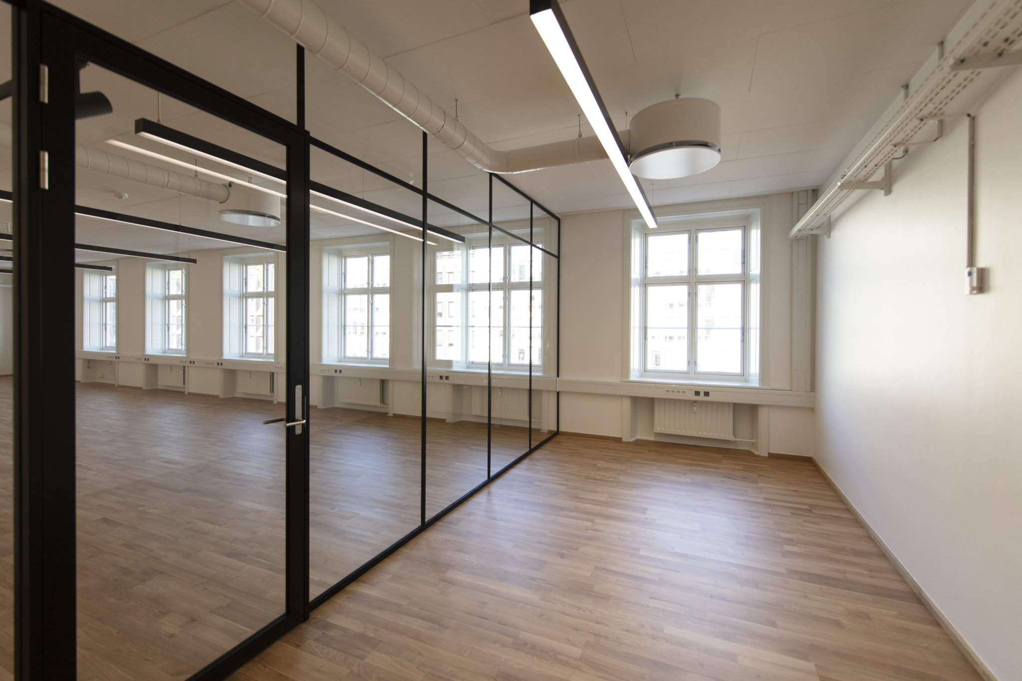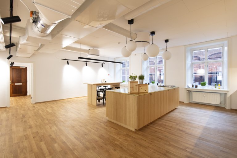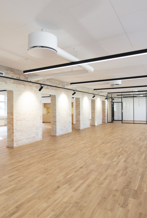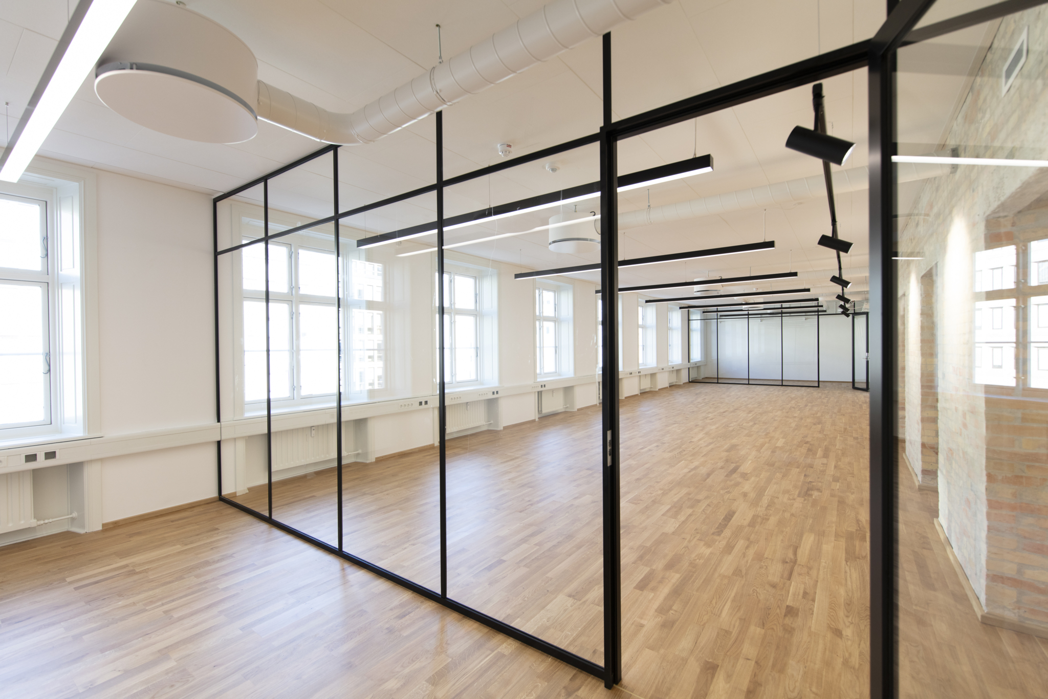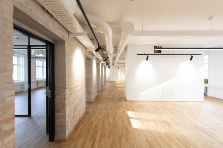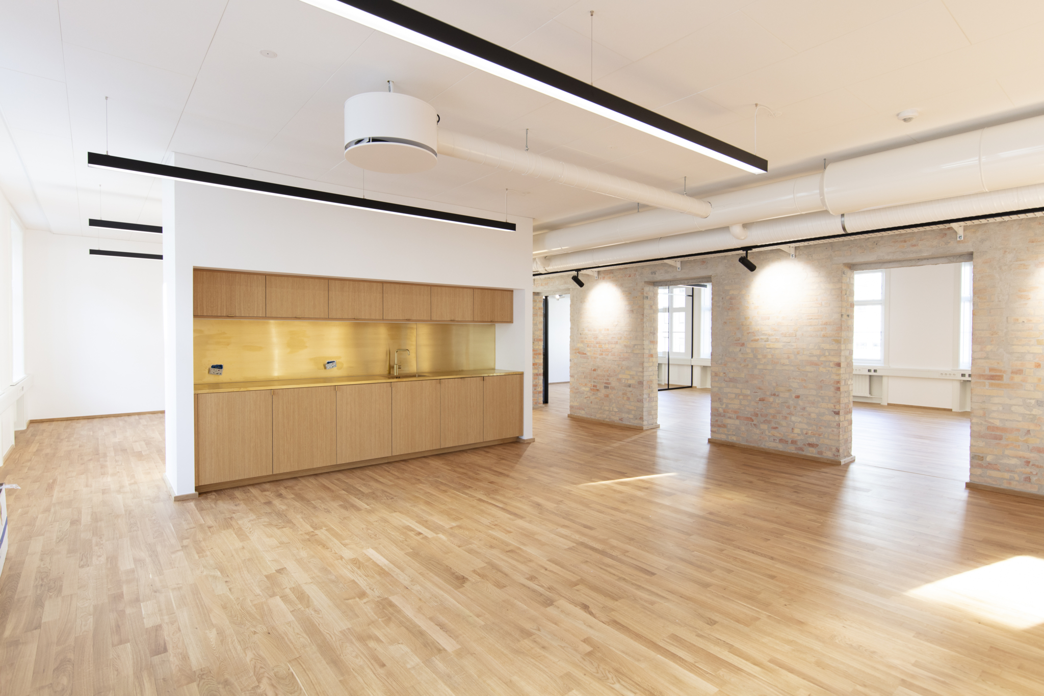Det nyindrettede lejemål byder på tekøkken, en åben planløsning med stor fleksibilitet og masser af dagslys fra de store vinduer mod gade og gård.
