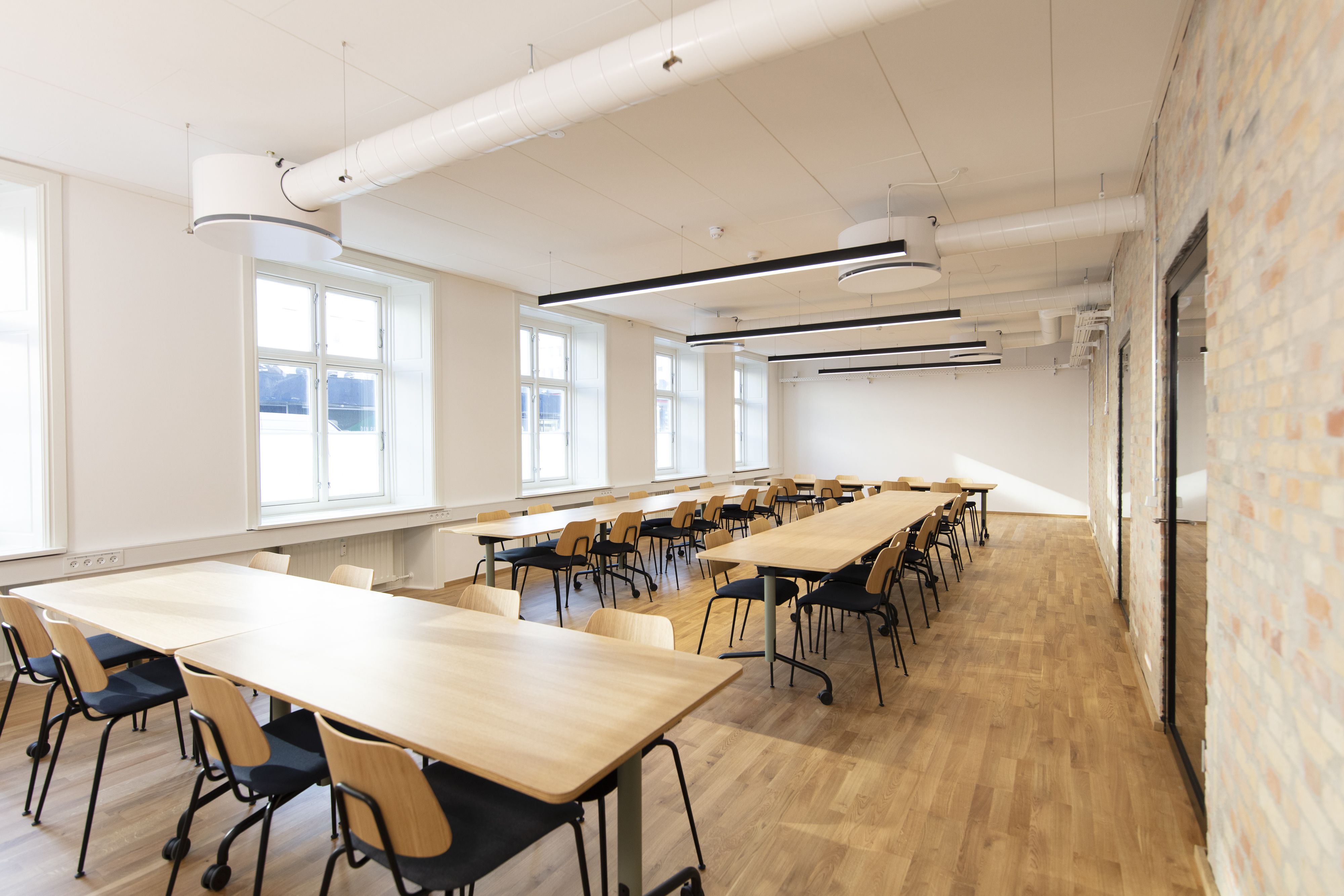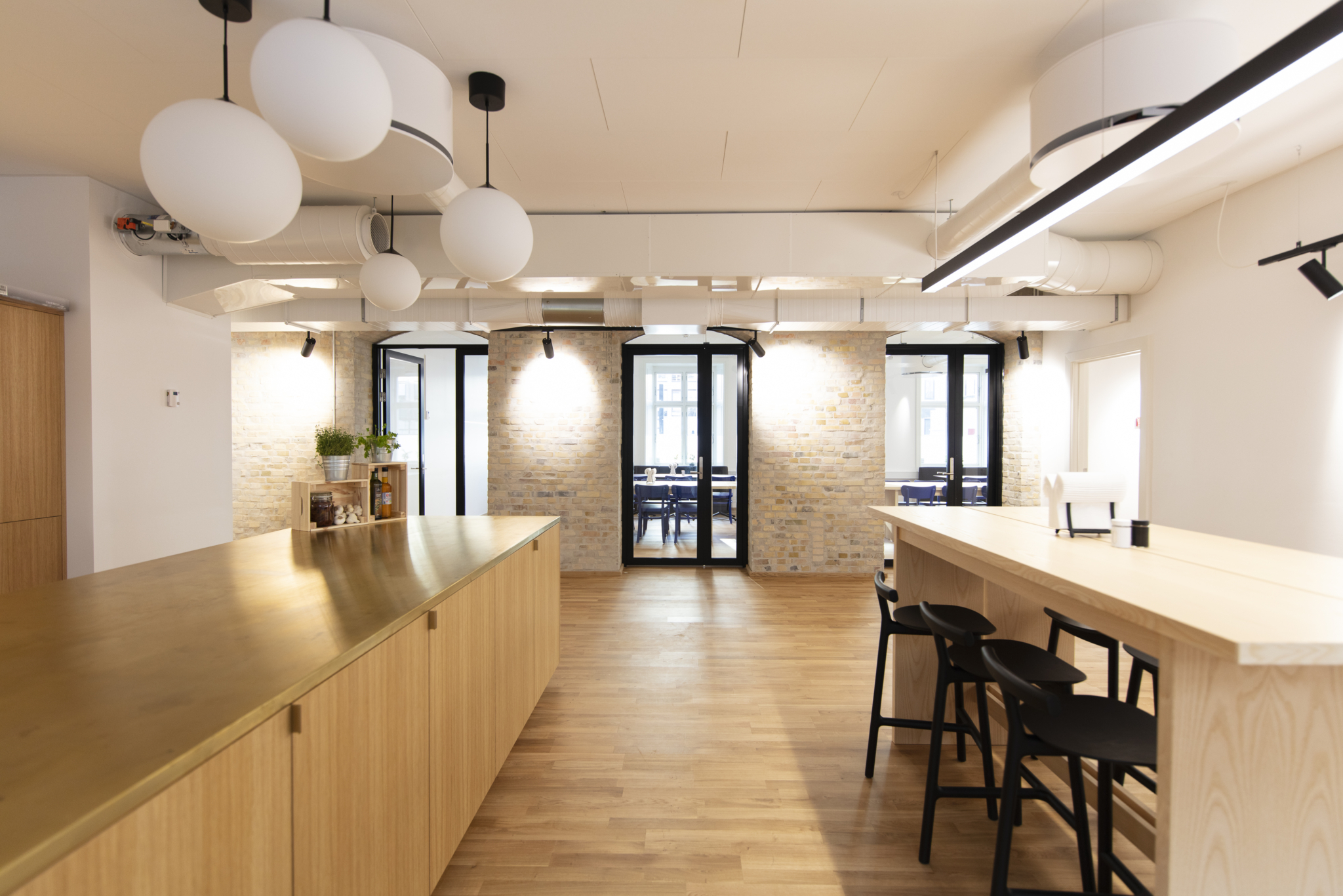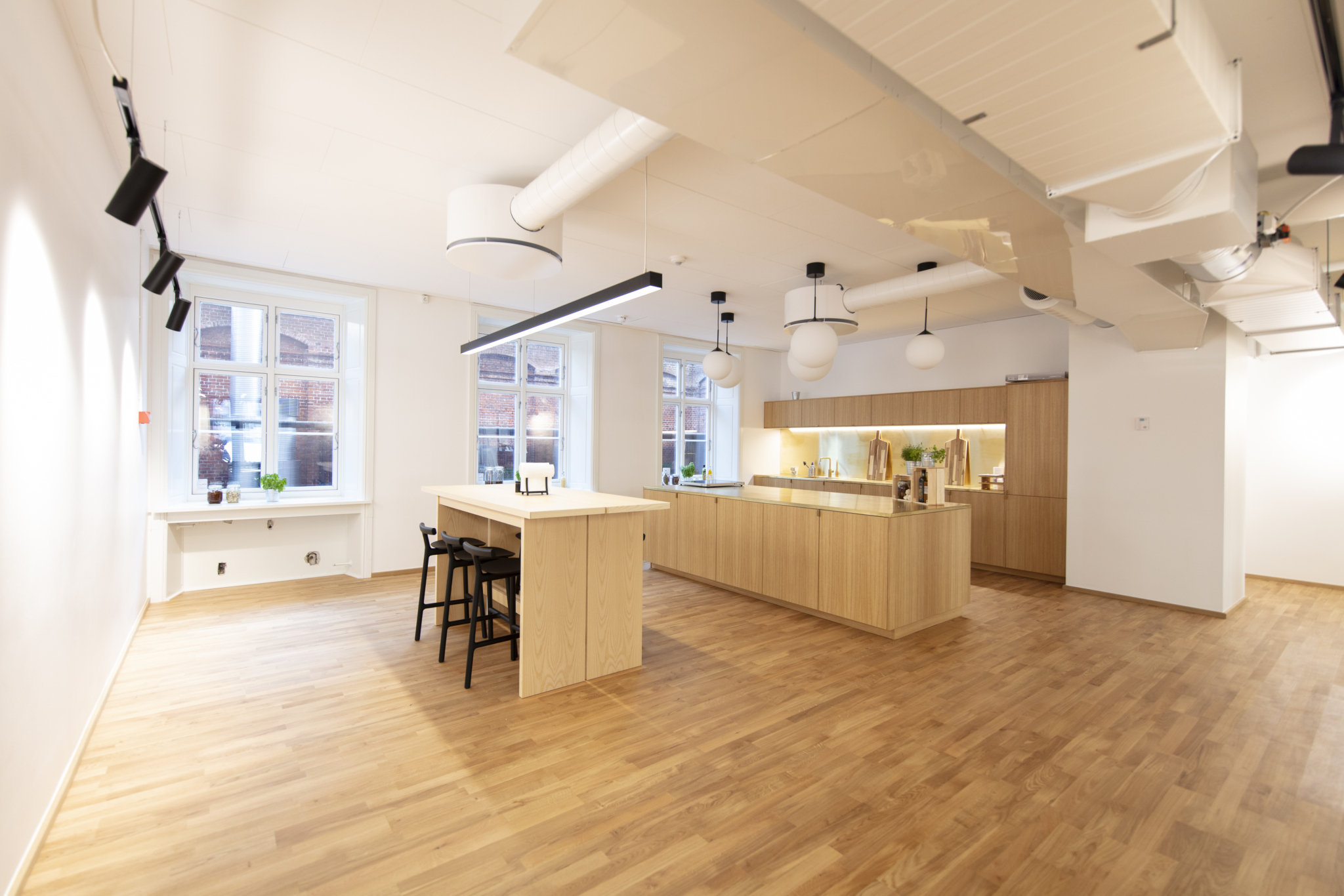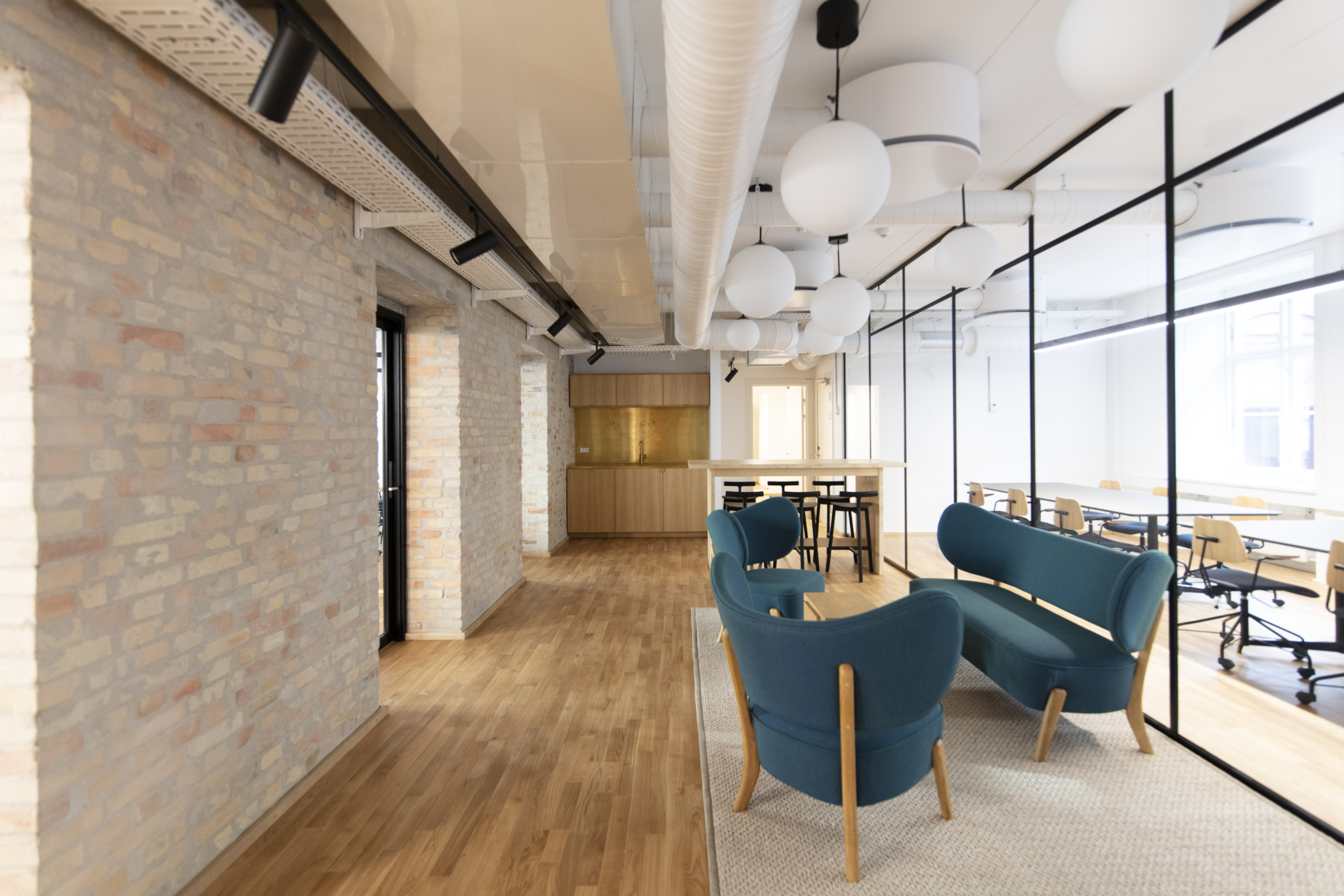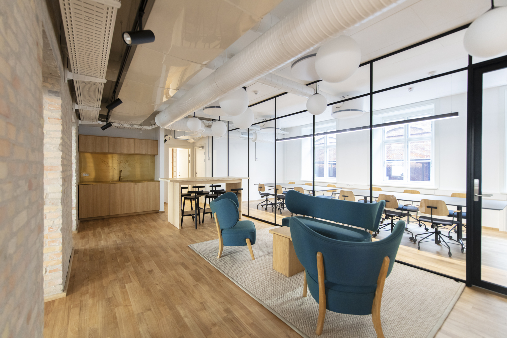 Det nyindrettede lejemål byder på tekøkken, en åben planløsning med stor fleksibilitet og masser af dagslys fra de store vinduer mod gade og gård.