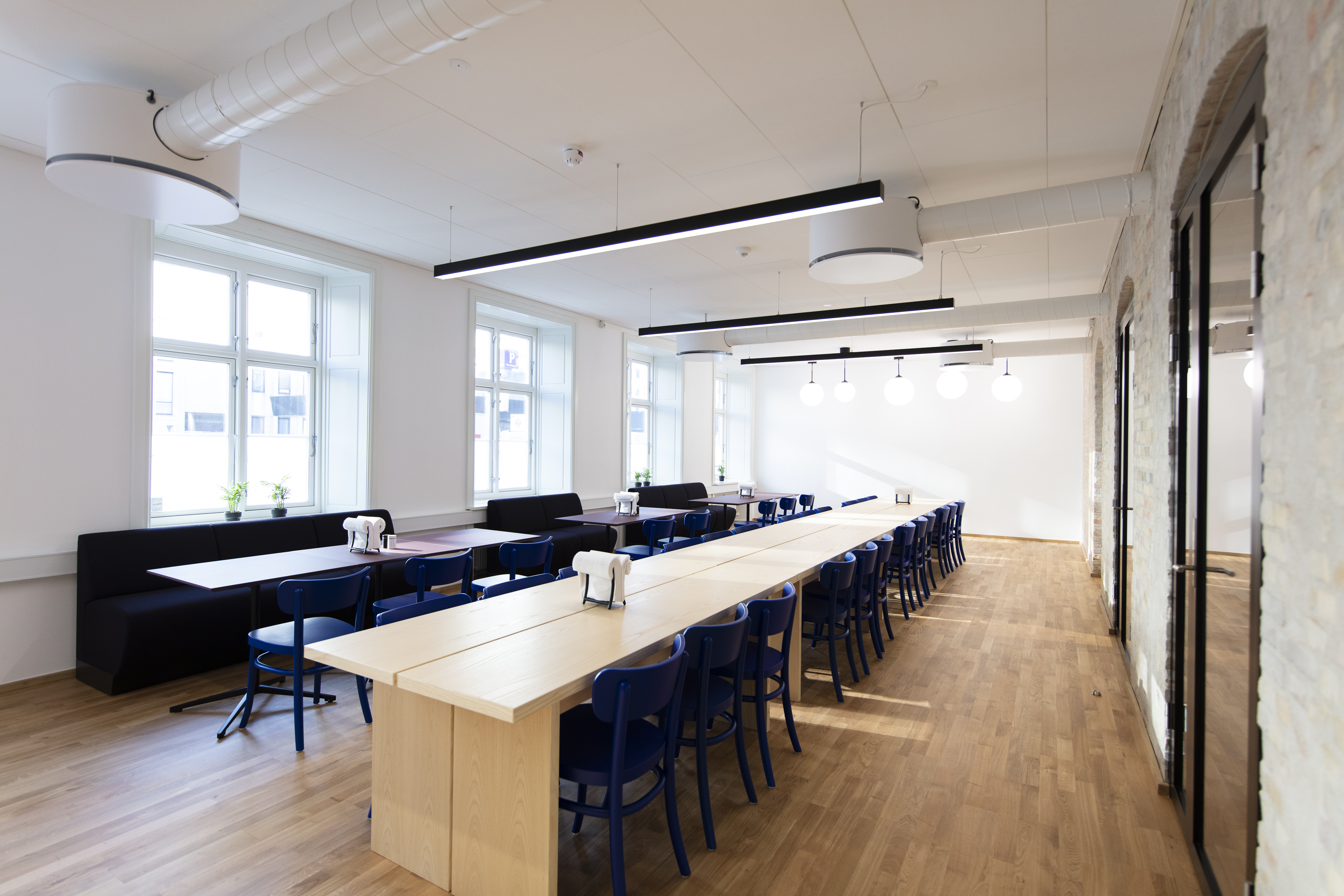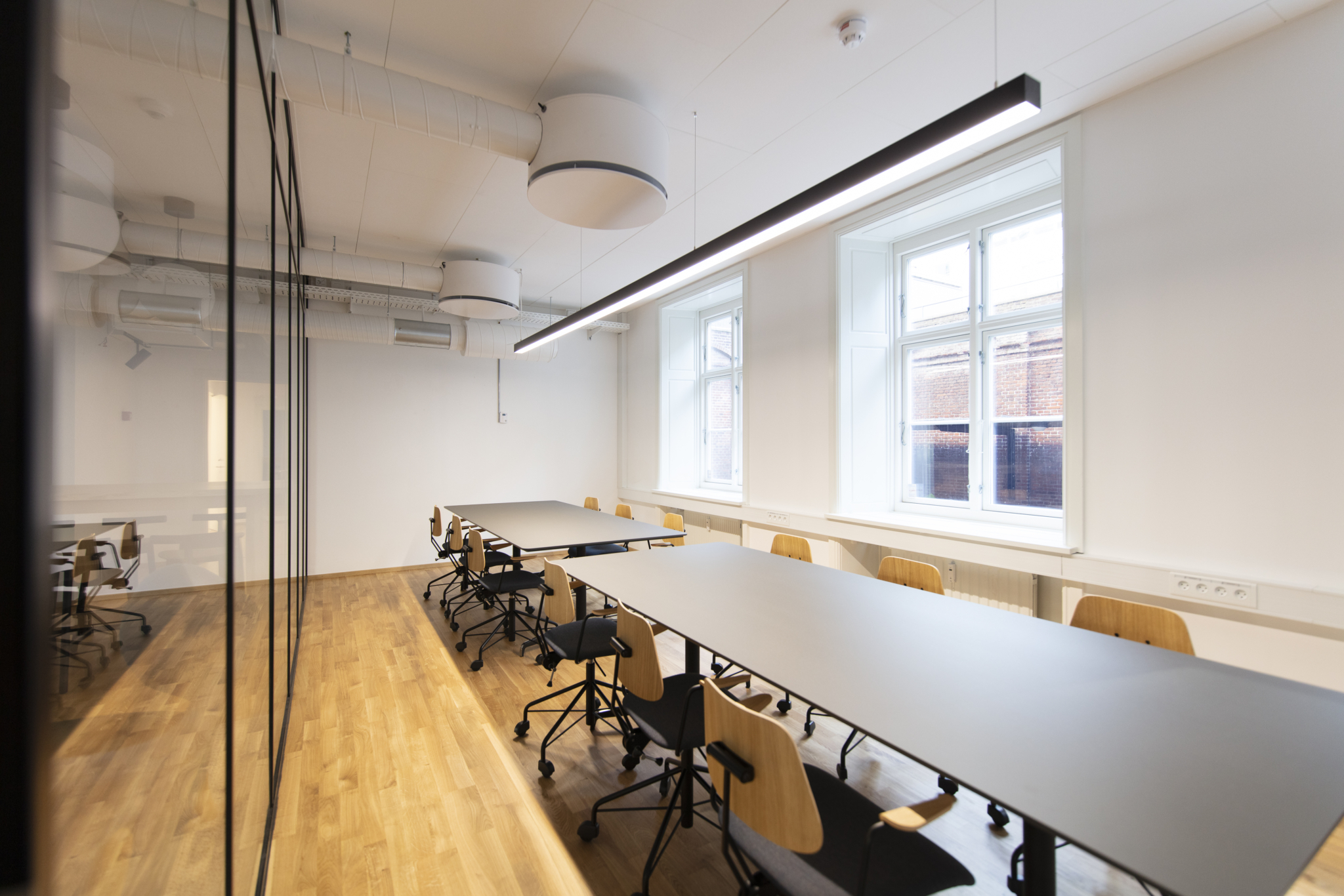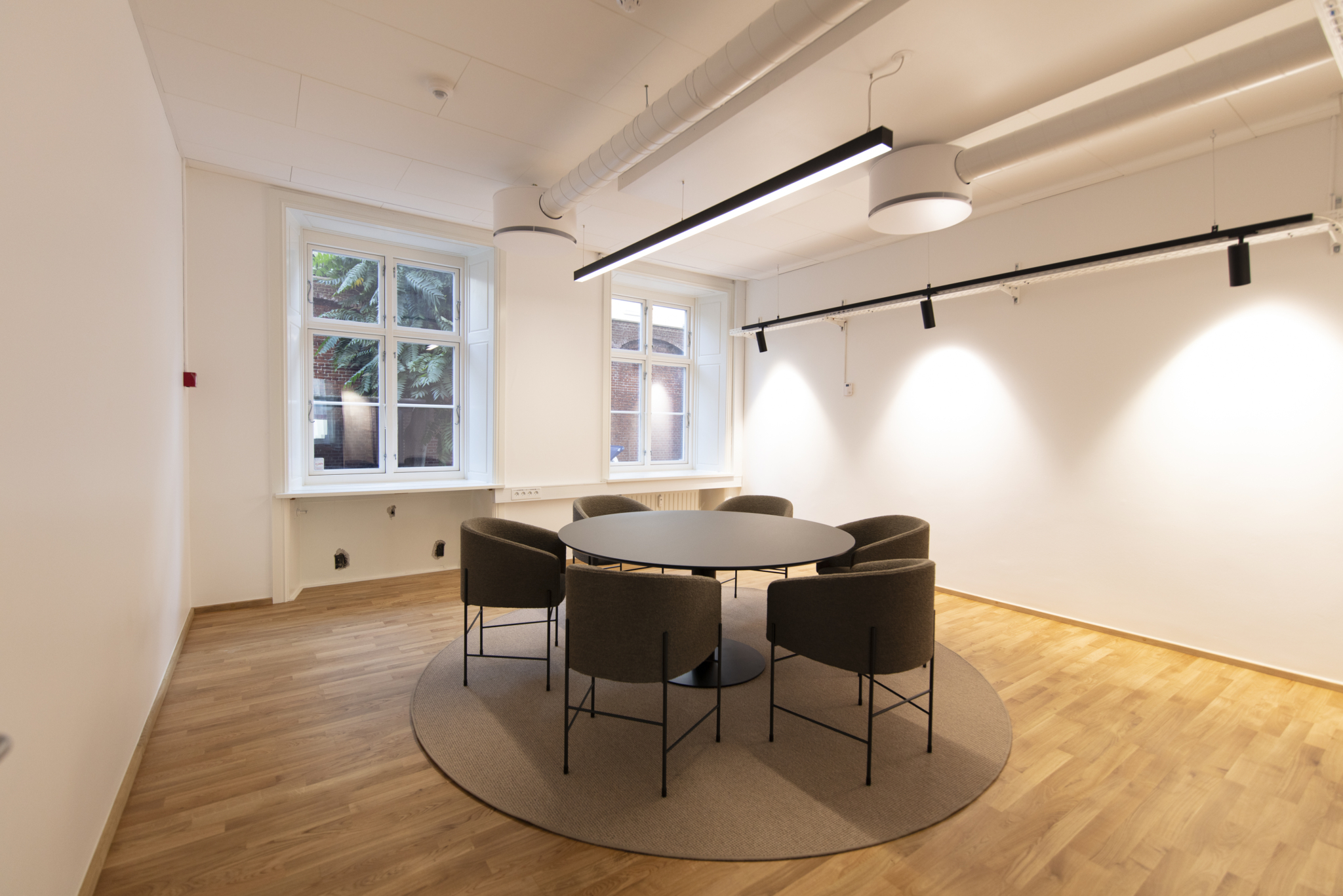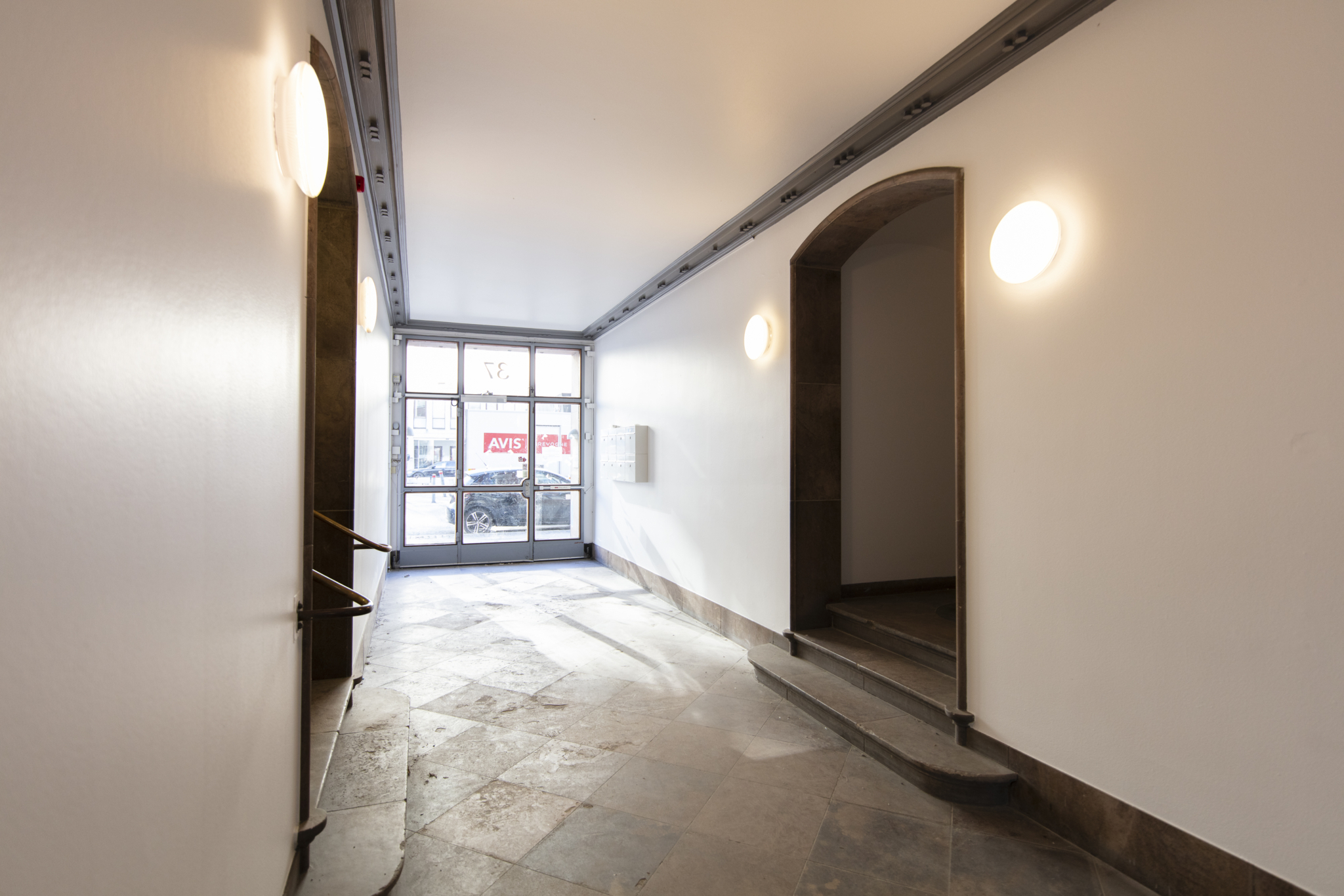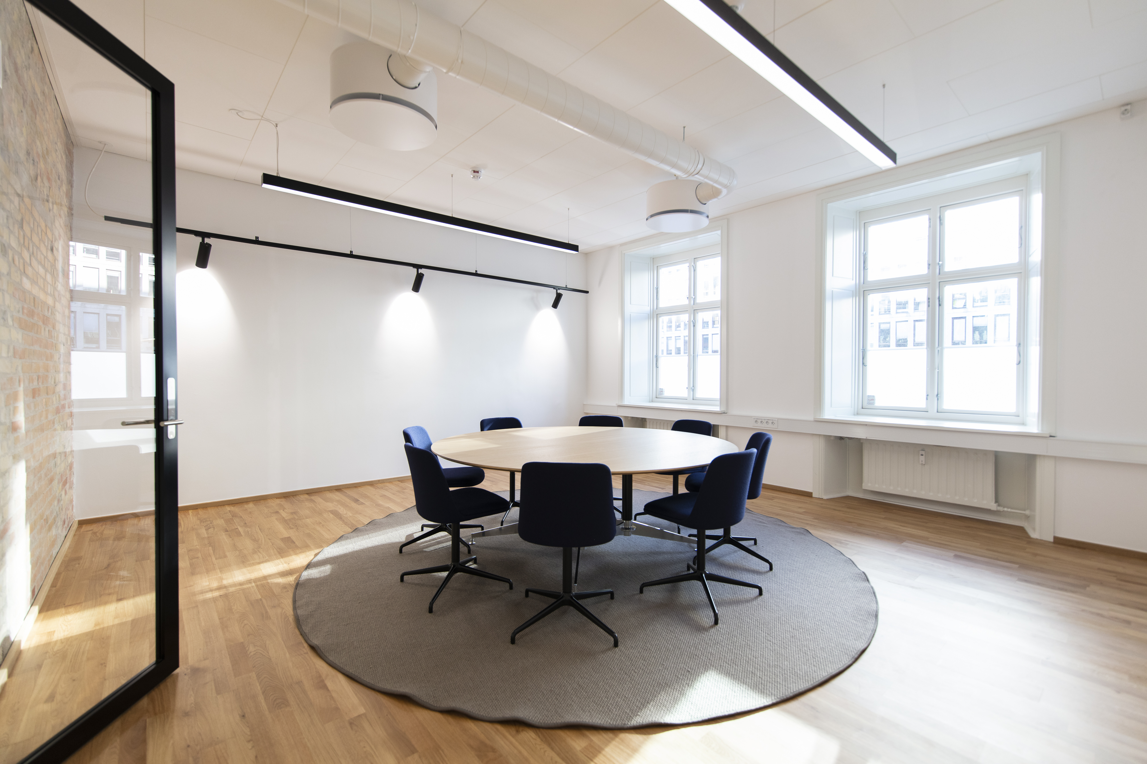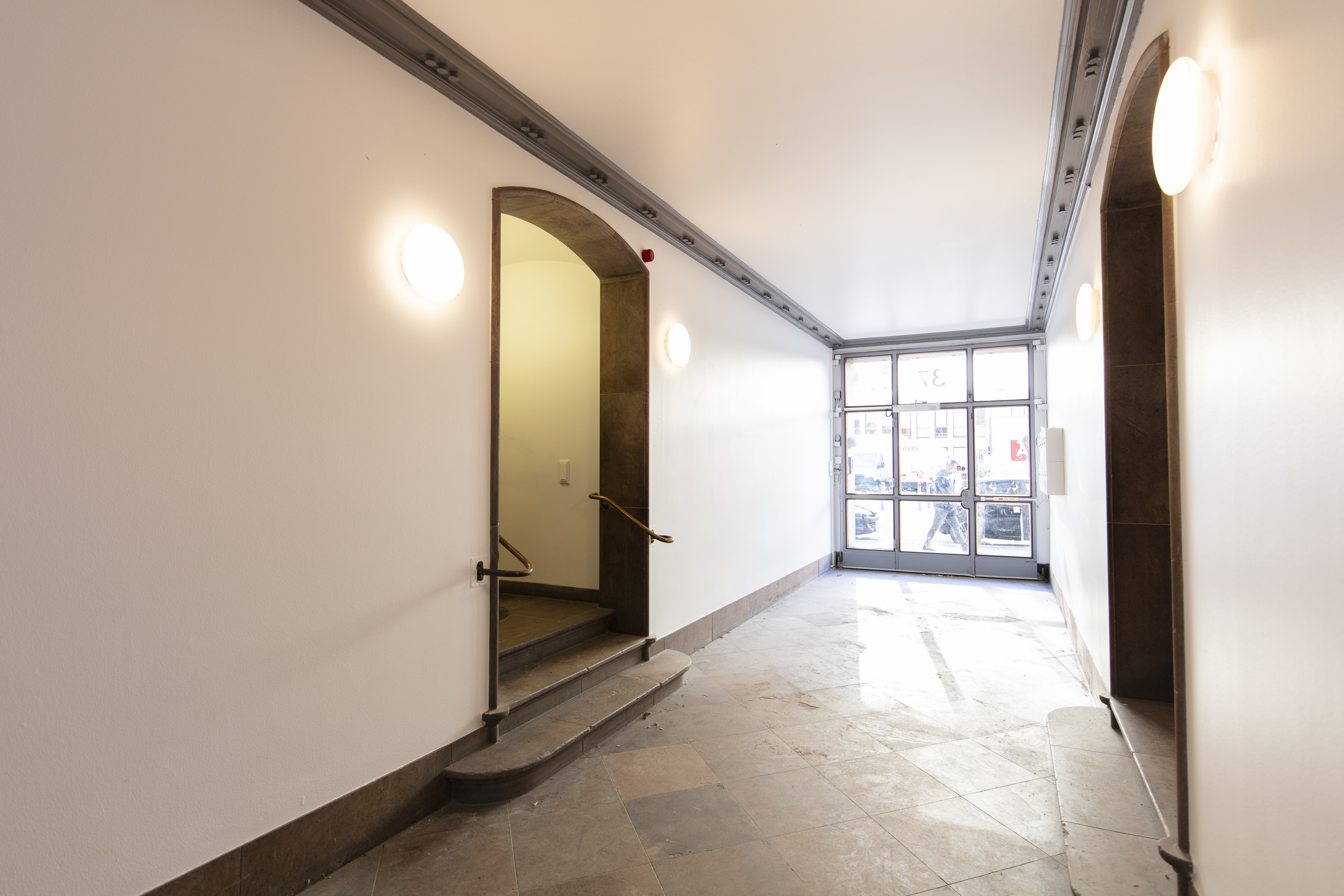 Det nyindrettede lejemål byder på tekøkken, en åben planløsning med stor fleksibilitet og masser af dagslys fra de store vinduer mod gade og gård.