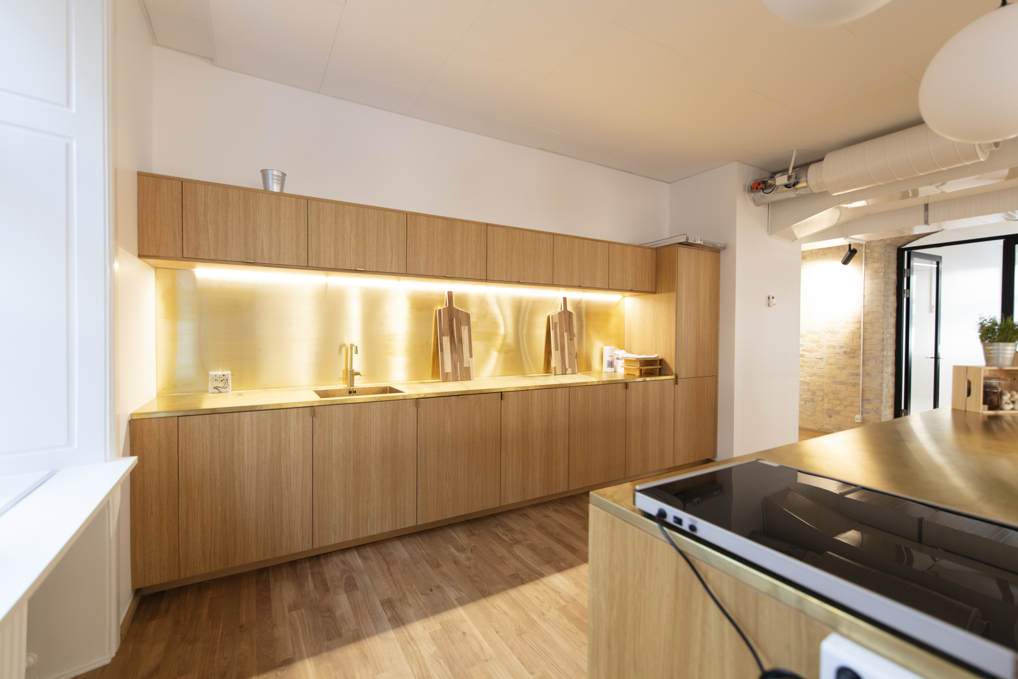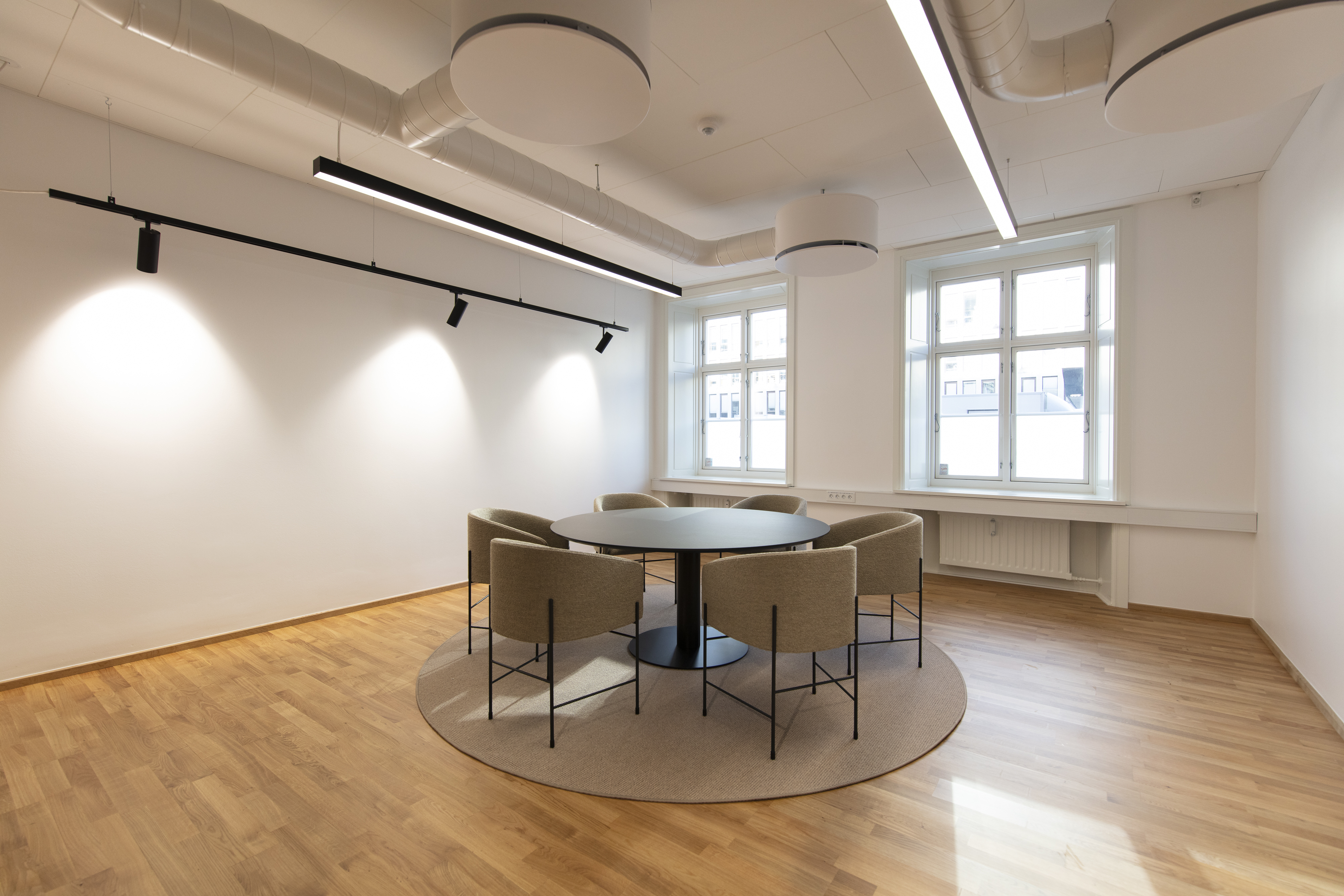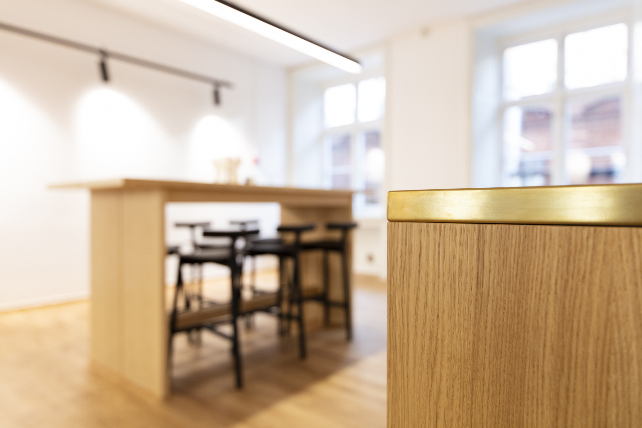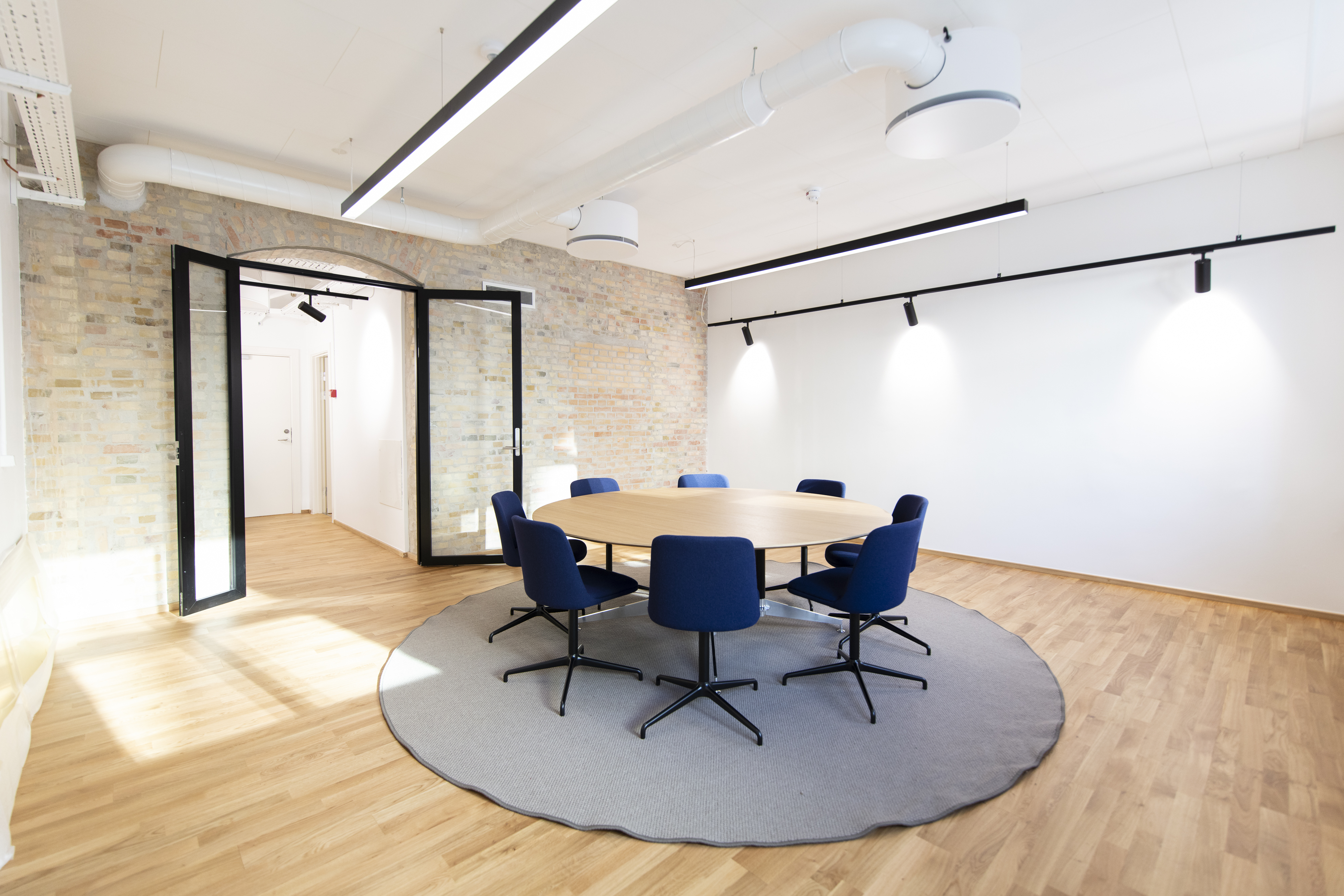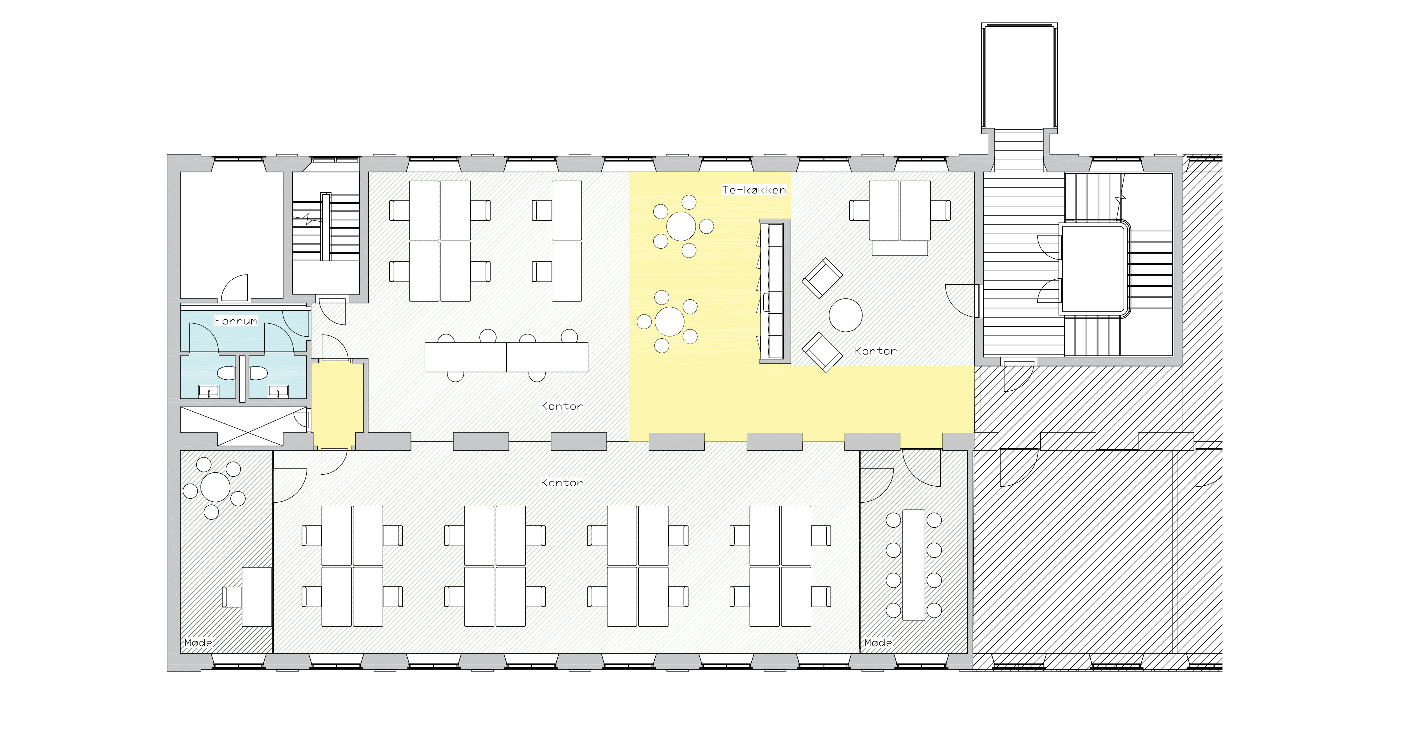 Det nyindrettede lejemål byder på tekøkken, en åben planløsning med stor fleksibilitet og masser af dagslys fra de store vinduer mod gade og gård.