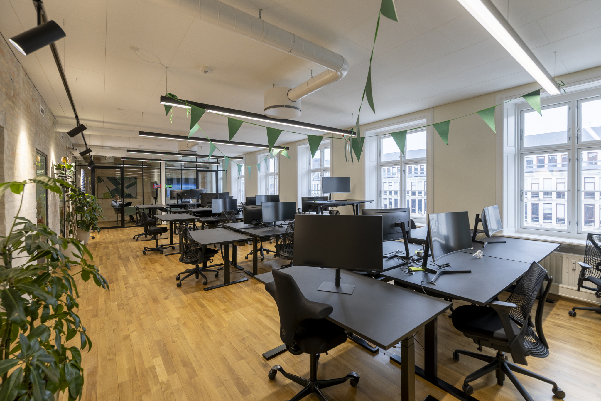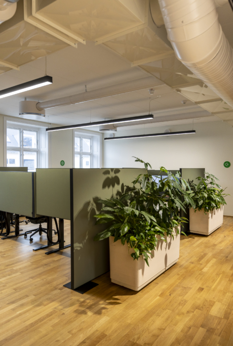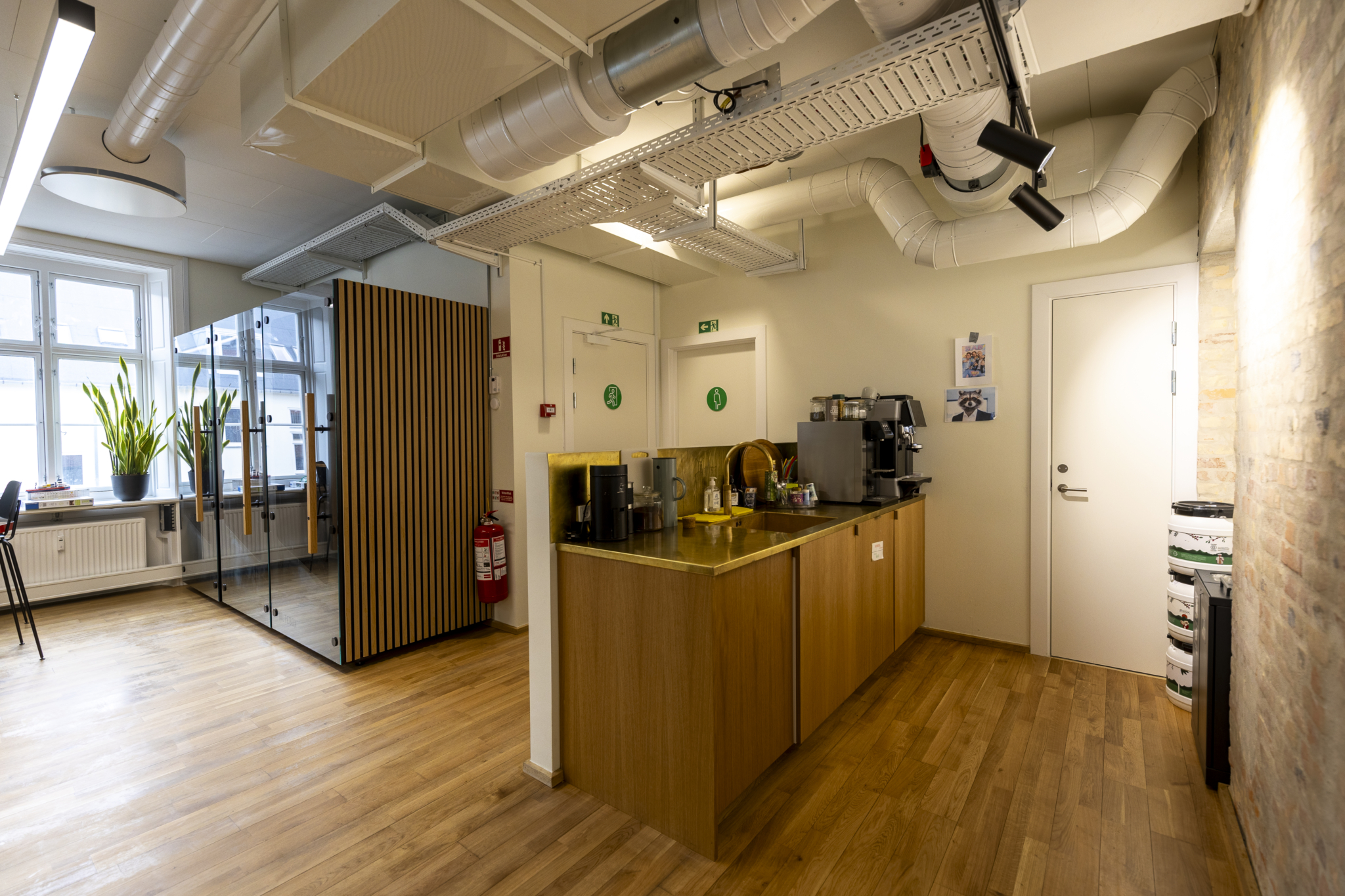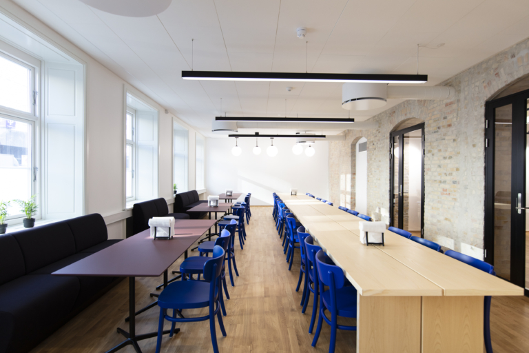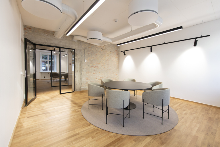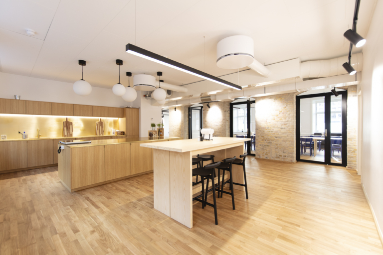 Det ledige lejemål har en gennemgående, bærende væg med blotlagt murværk. Det skaber luftige og gennemlyste lokaler og giver stor fleksibilitet i indretningen med mulighed for både storrumsmiljøer eller mindre kontorer og mødelokaler. Et eksklusivt tekøkken og tilhørende loungeområde fungerer som kontorets naturlige samlingssted og giver plads til uformelle møder.