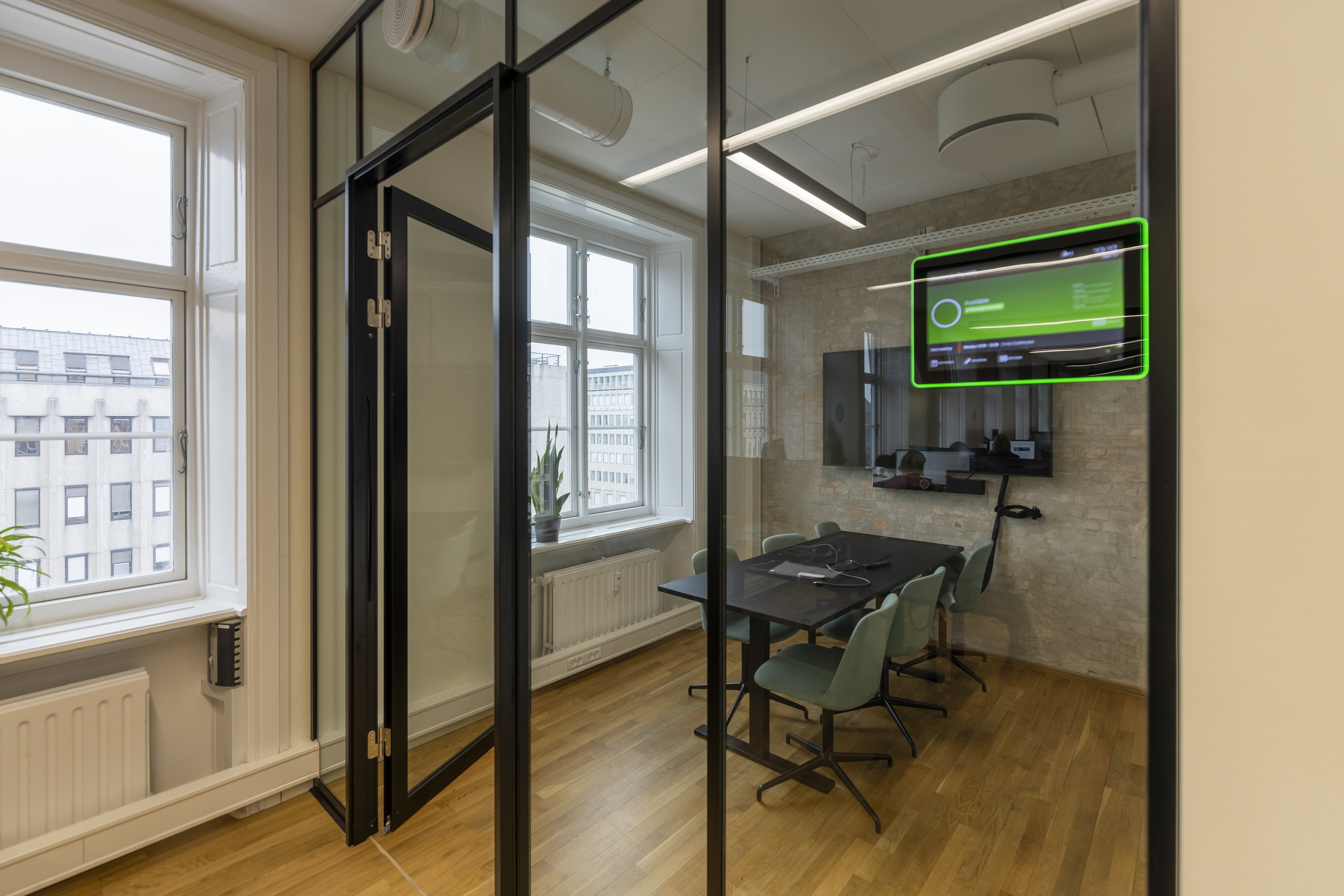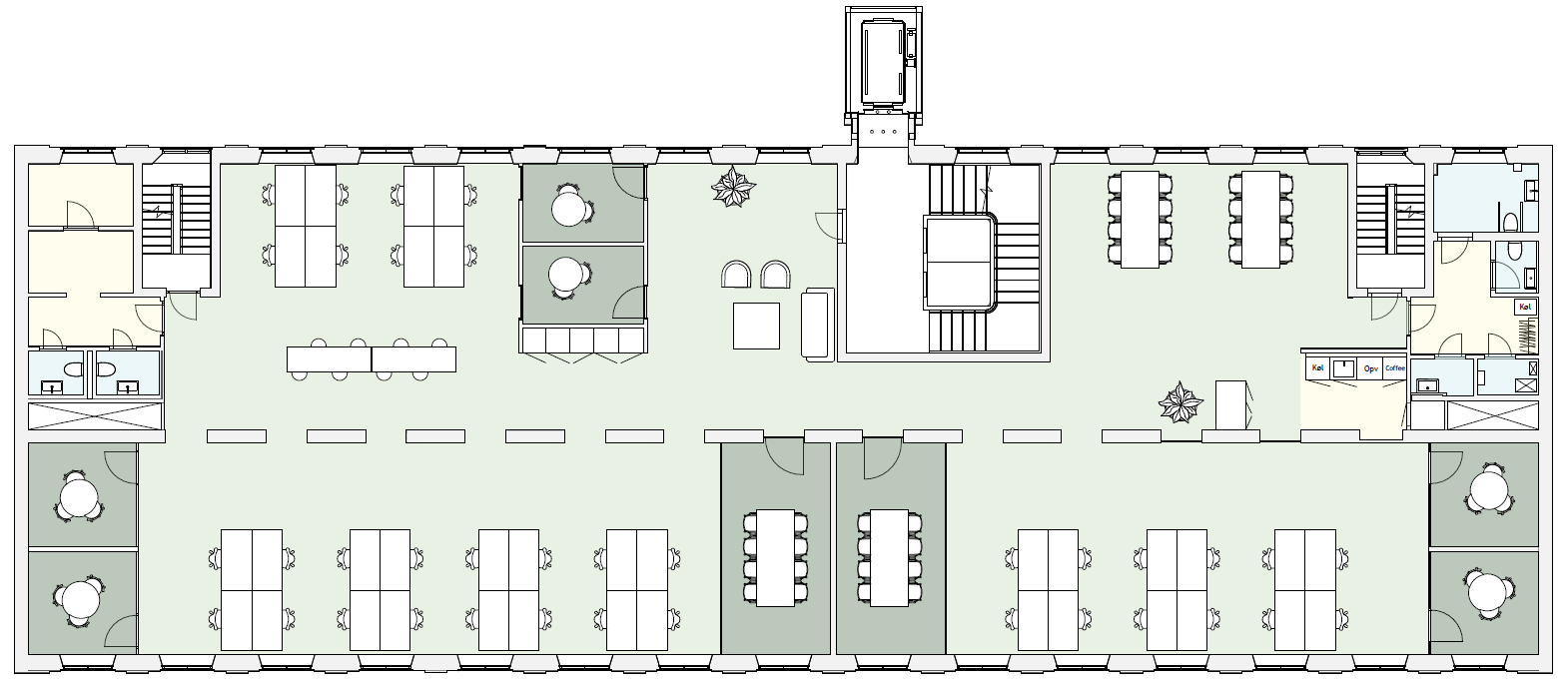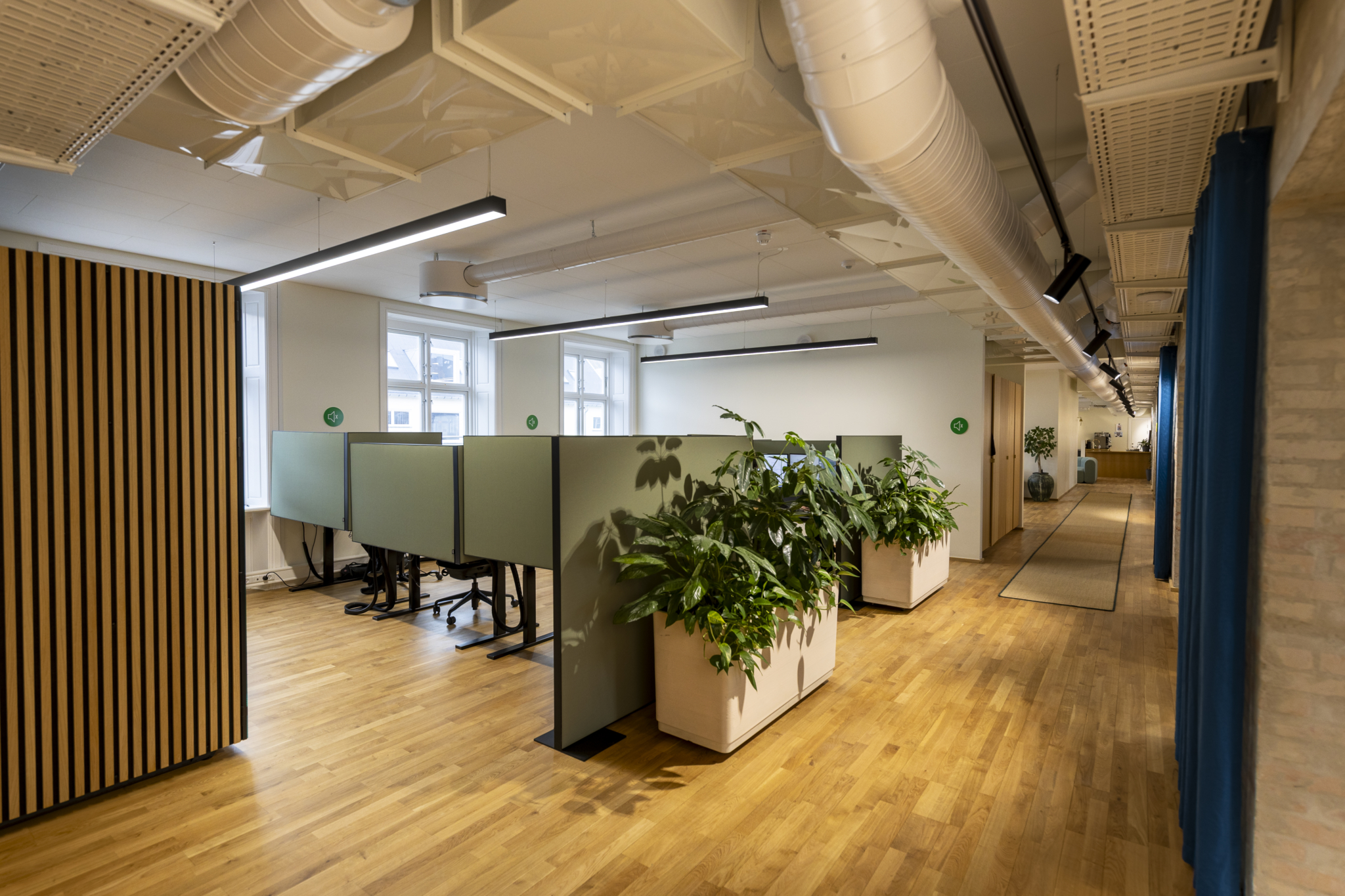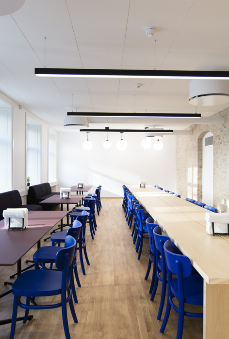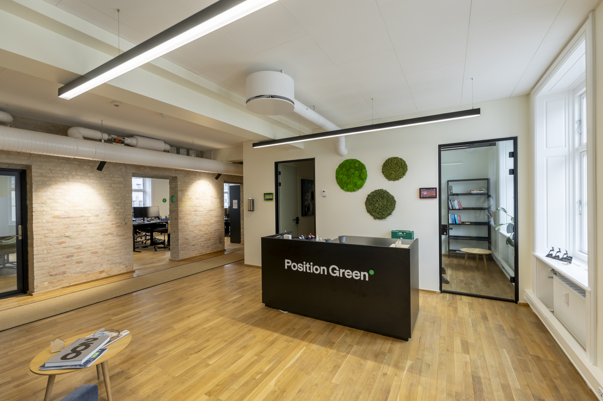 Det ledige lejemål har en gennemgående, bærende væg med blotlagt murværk. Det skaber luftige og gennemlyste lokaler og giver stor fleksibilitet i indretningen med mulighed for både storrumsmiljøer eller mindre kontorer og mødelokaler. Et eksklusivt tekøkken og tilhørende loungeområde fungerer som kontorets naturlige samlingssted og giver plads til uformelle møder.