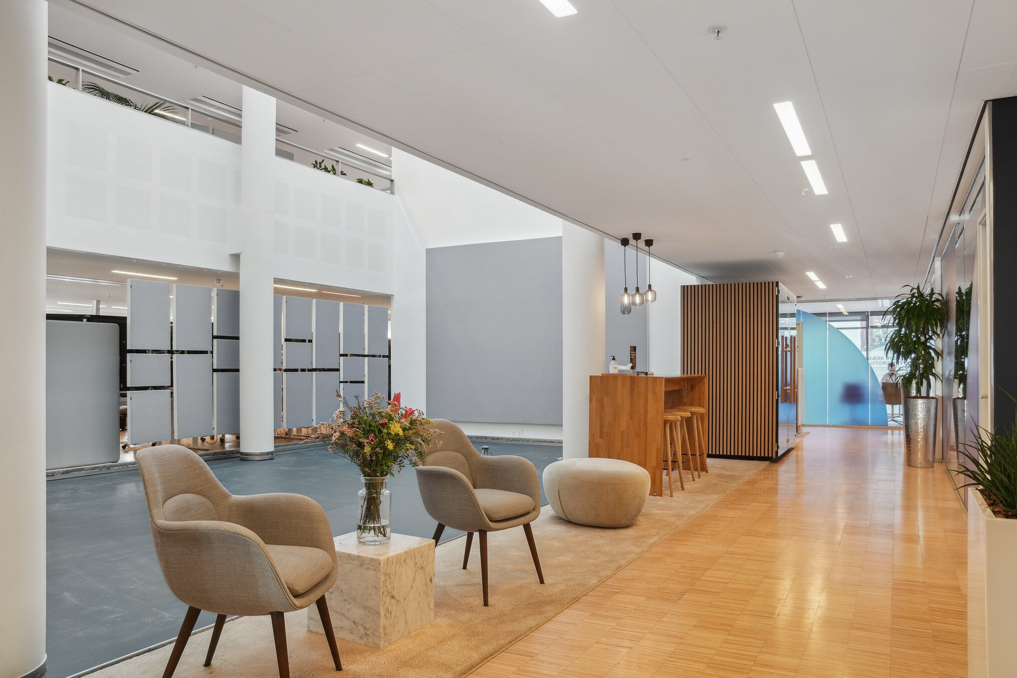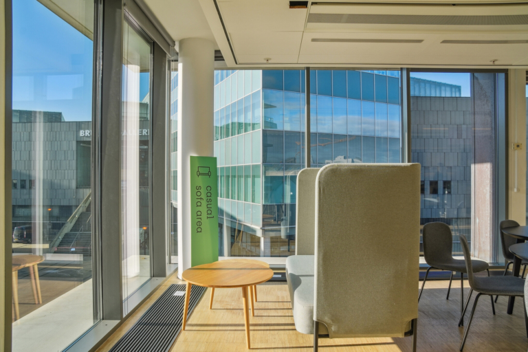 Den nuværende indretning er fleksibel med primært åbne planløsninger suppleret med enkelte lukkede kontorer og mødelokaler. Desuden er der indbydende tekøkkener på alle etager.