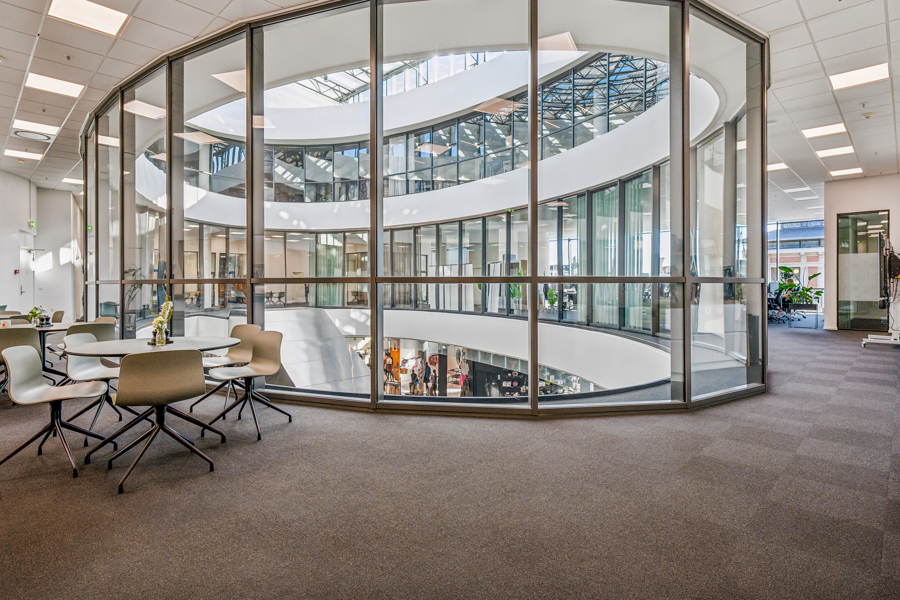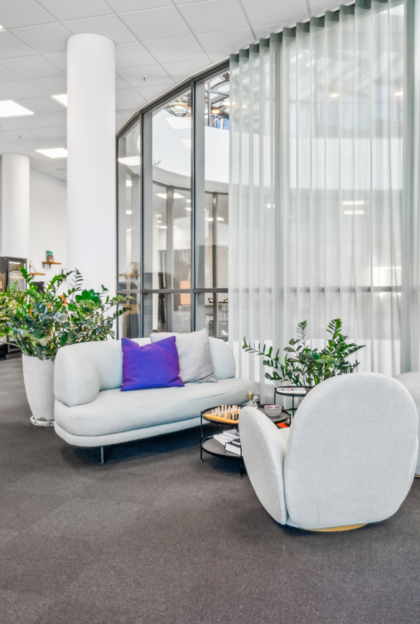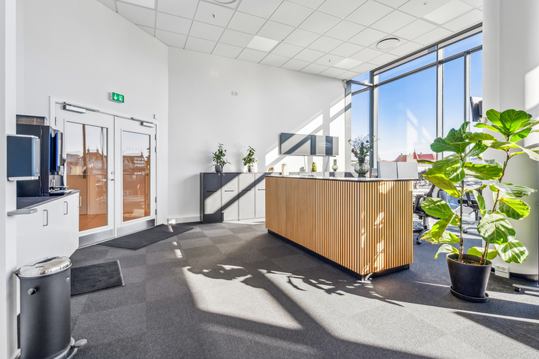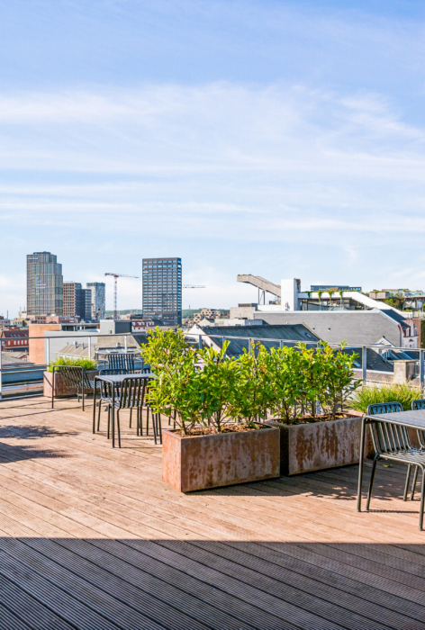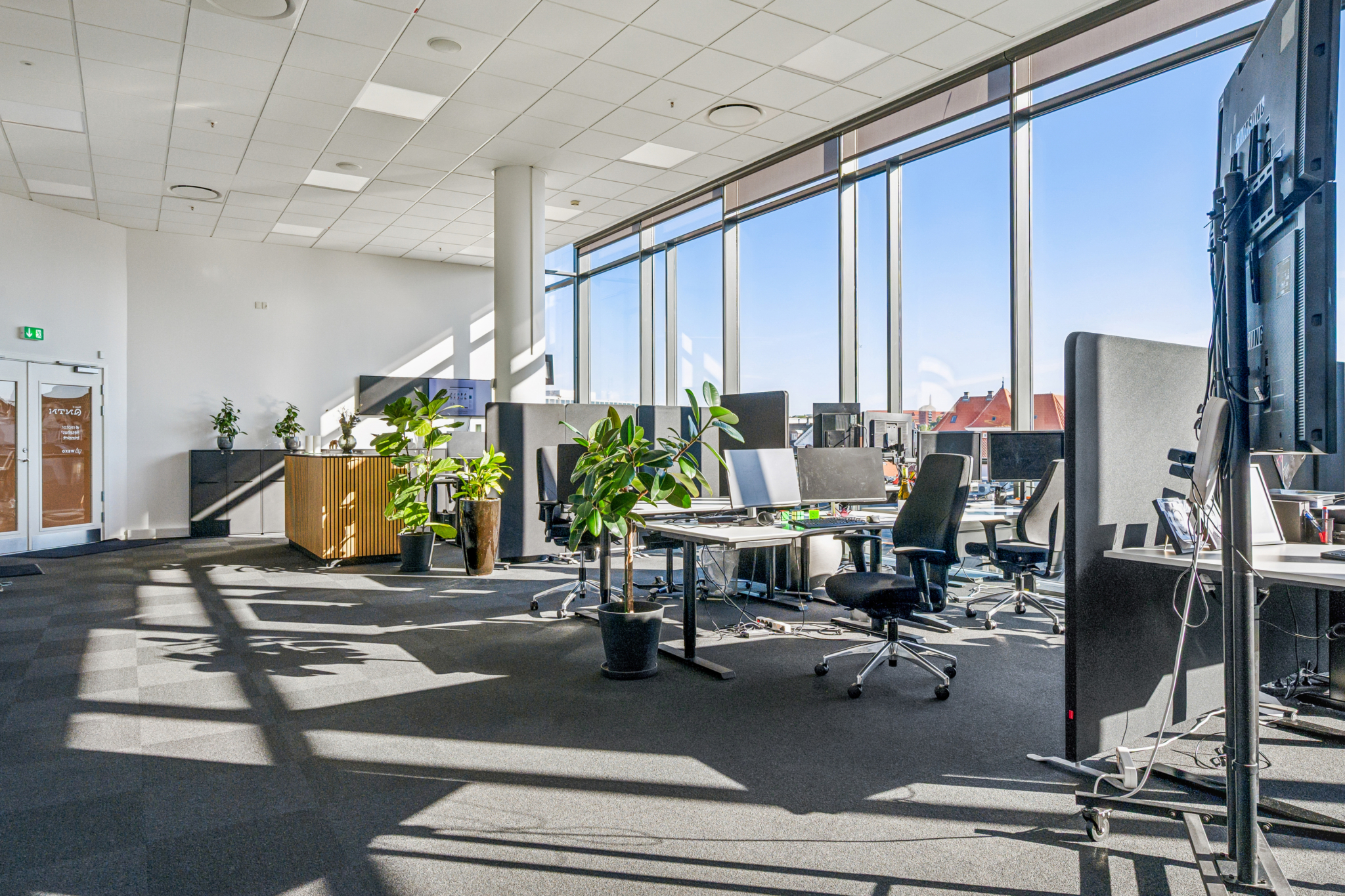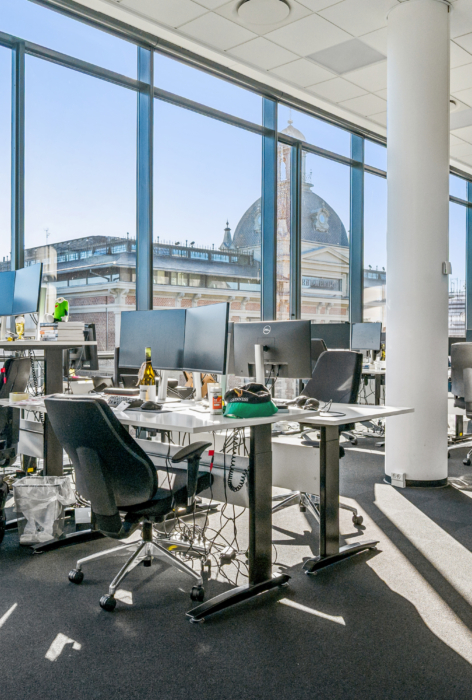 Med indgang fra Åboulevarden – lige overfor caféerne Sidewalk og Grappa – kan man tage elevatoren op til det åbne og indbydende kontor på 4. sal. Her bliver man mødt af et lyst, højloftet og åbent kontorlandskab, hvor enorme gulv til loft vinduespartier åbner for en fantastisk udsigt over Aarhus.